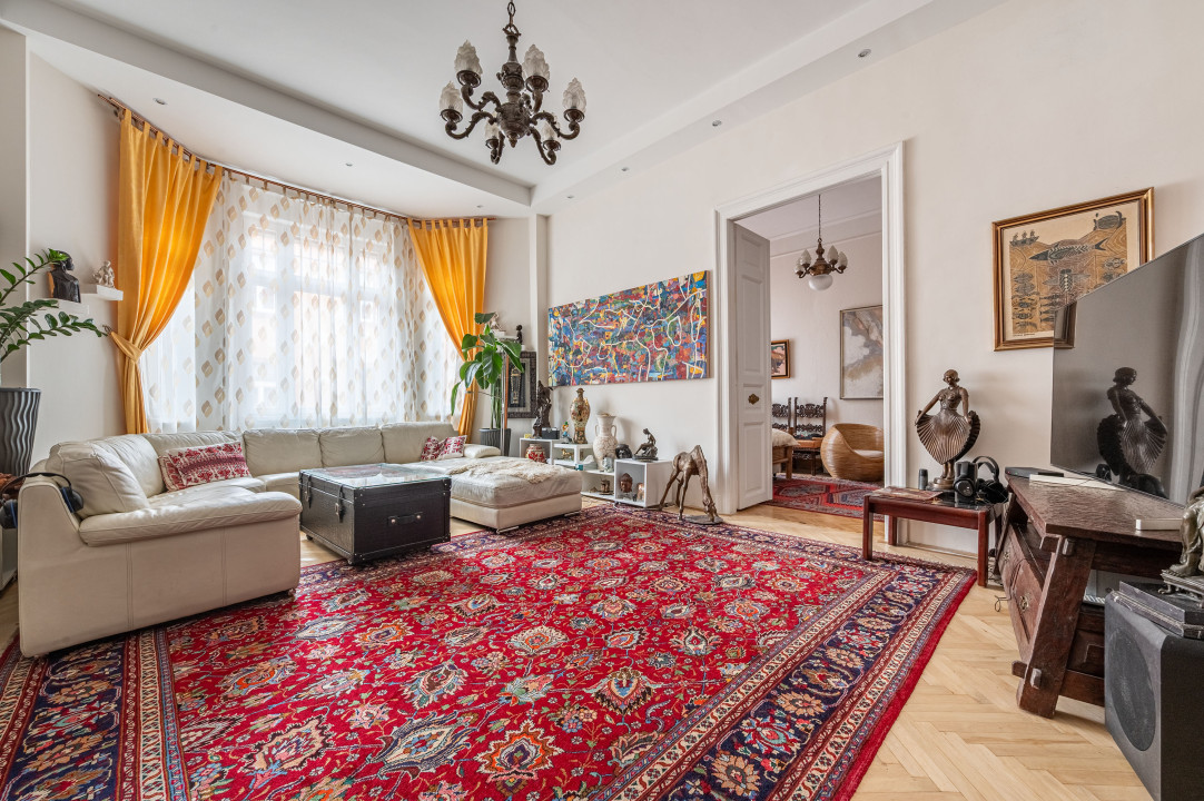 Die Aufteilung der 112 qm großen Wohnung ist hervorragend, sie wurde während des Sozialismus nicht demontiert/getrennt, sie bewahrt ihre ursprüngliche bürgerliche Aufteilung, mit einem zentral gelegenen Wohnzimmer mit Rizalito und einer Schlafzimmeraufteilung, die sich symmetrisch nach beiden Seiten öffnet.auf beiden Seiten öffnet. Die Wohnung befindet sich im 3. Stock und ist im Gegensatz zu vielen neuen Vorstadtwohnungen sehr hell und luftig.