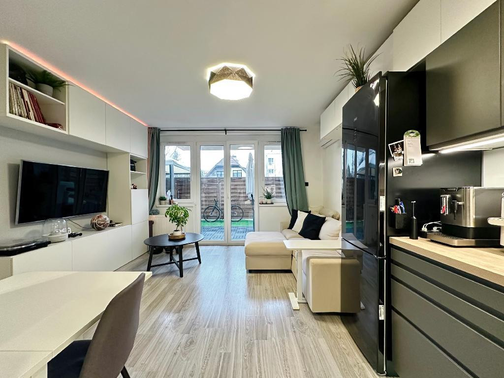 A nyugati tájolású ingatlan nagy üvegfelületeinek köszönhetően egész nap világos, a kert előtt lévő szabad tér pedig különösen tágas, nyugodt térérzetet ad, gyönyörű naplementével. Az amerikai konyhás nappali tágas, a konyhabútor mérete a megszokottnál nagyobb, a nappaliban pedig telefonról vezérelhető, wifi-s klíma biztosítja a kényelmet. A hálószoba teljes értékű, gardróbszekrénnyel és dolgozósarokkal, így akár home office-ra is kiválóan alkalmas. A lakásban külön WC és kádas fürdőszoba található, beépített szellőztetéssel.