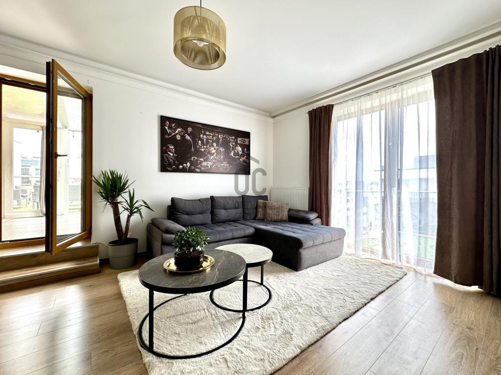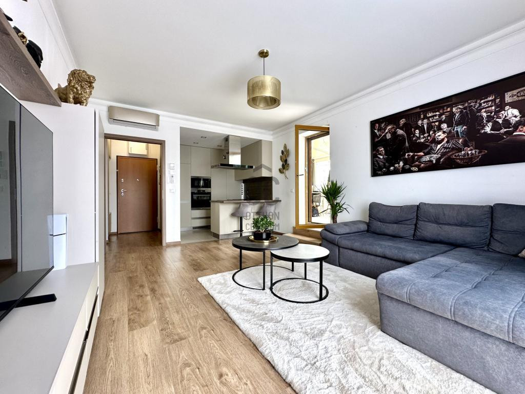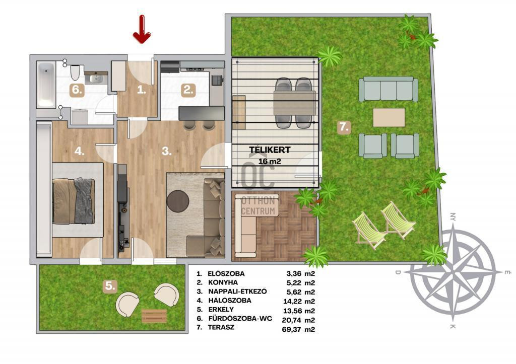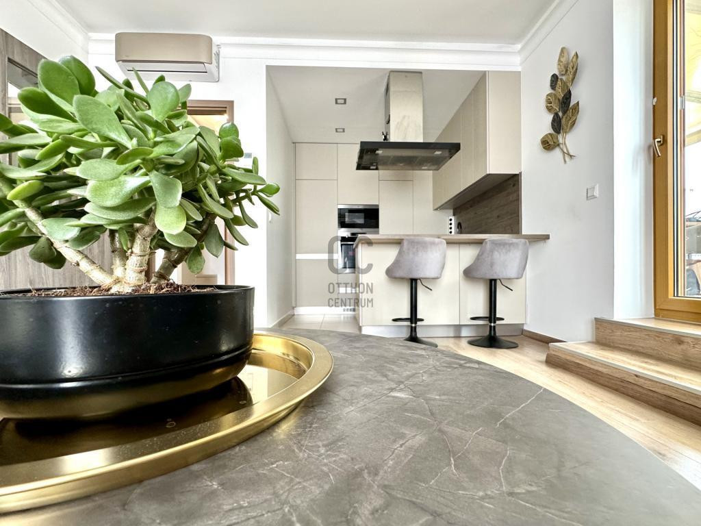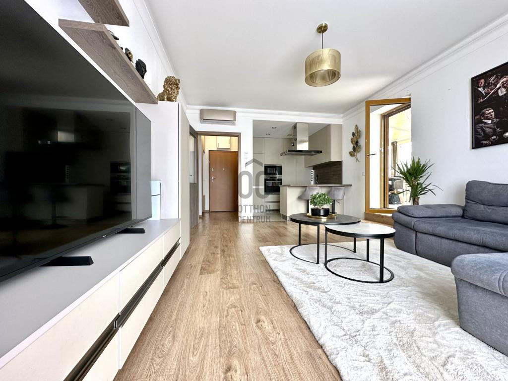 - Felosztása: előtér, amerikai konyhás nappali és étkező, hálószoba, kádas fürdőszoba, WC, terasz télikerttel, erkély.