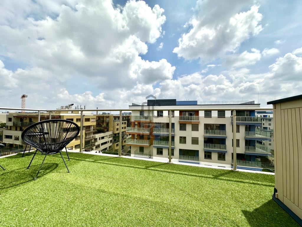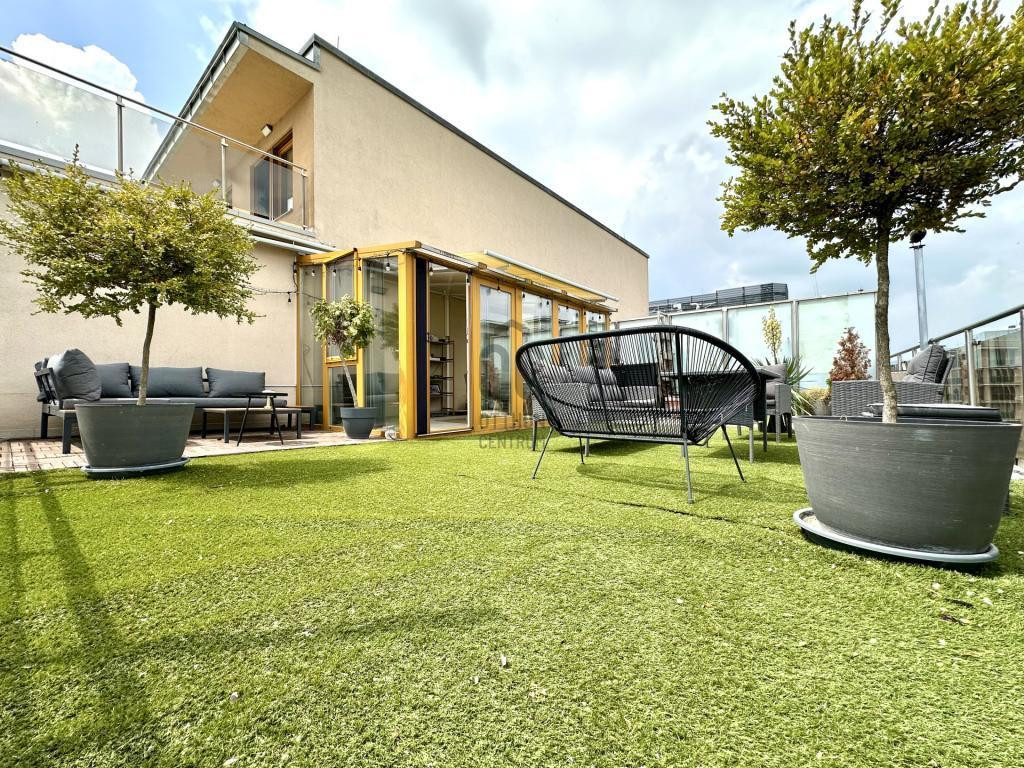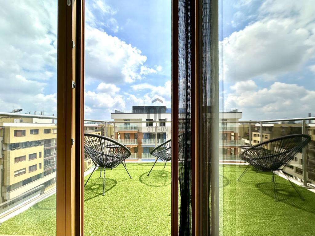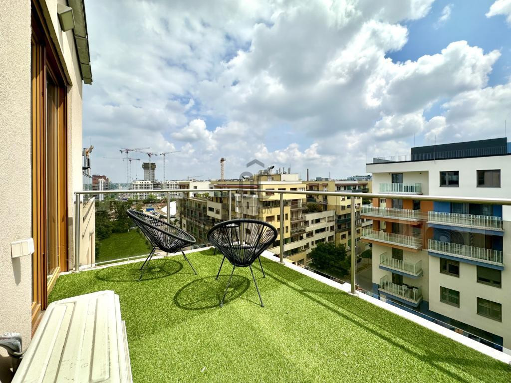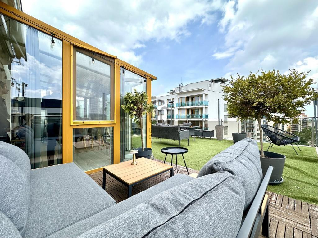 - 8. emeleti, 49 m2-es, 2 szobás, 70 m2-es privát terasszal, 16 m2-es télikerttel és 14 m2-es erkéllyel rendelkező ingatlan.