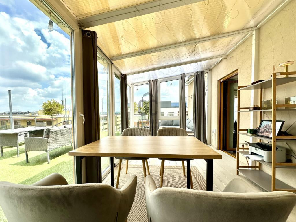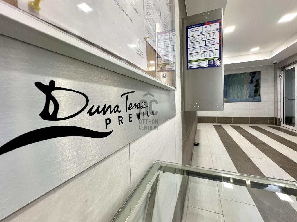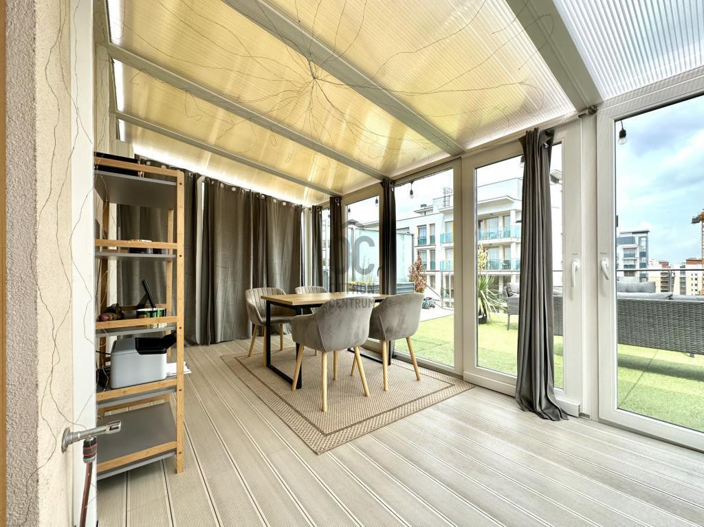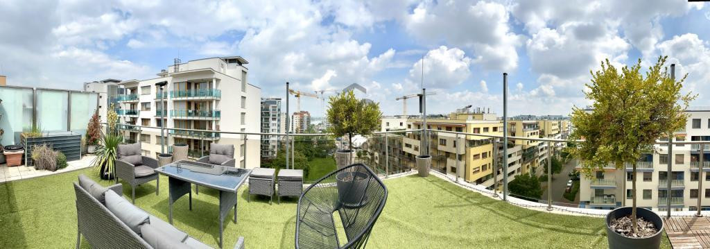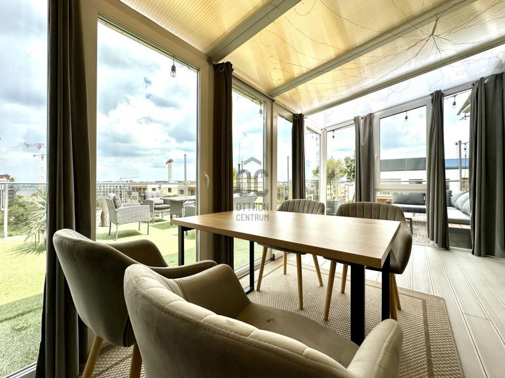 Panorámás teraszos, nagy erkélyes, 2 szobás, igényes penthouse lakás, épített télikerttel eladó a Marina Parton.