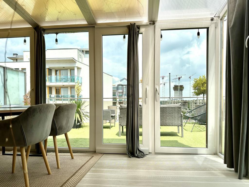 - A tágas nappaliból a télikerten keresztül juthatunk a privát teraszra, a hálószobából pedig kijárat van a nagy erkélyre.