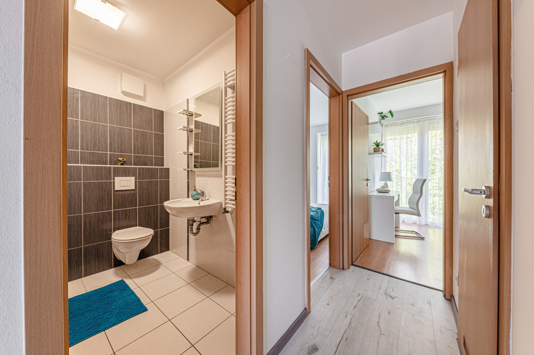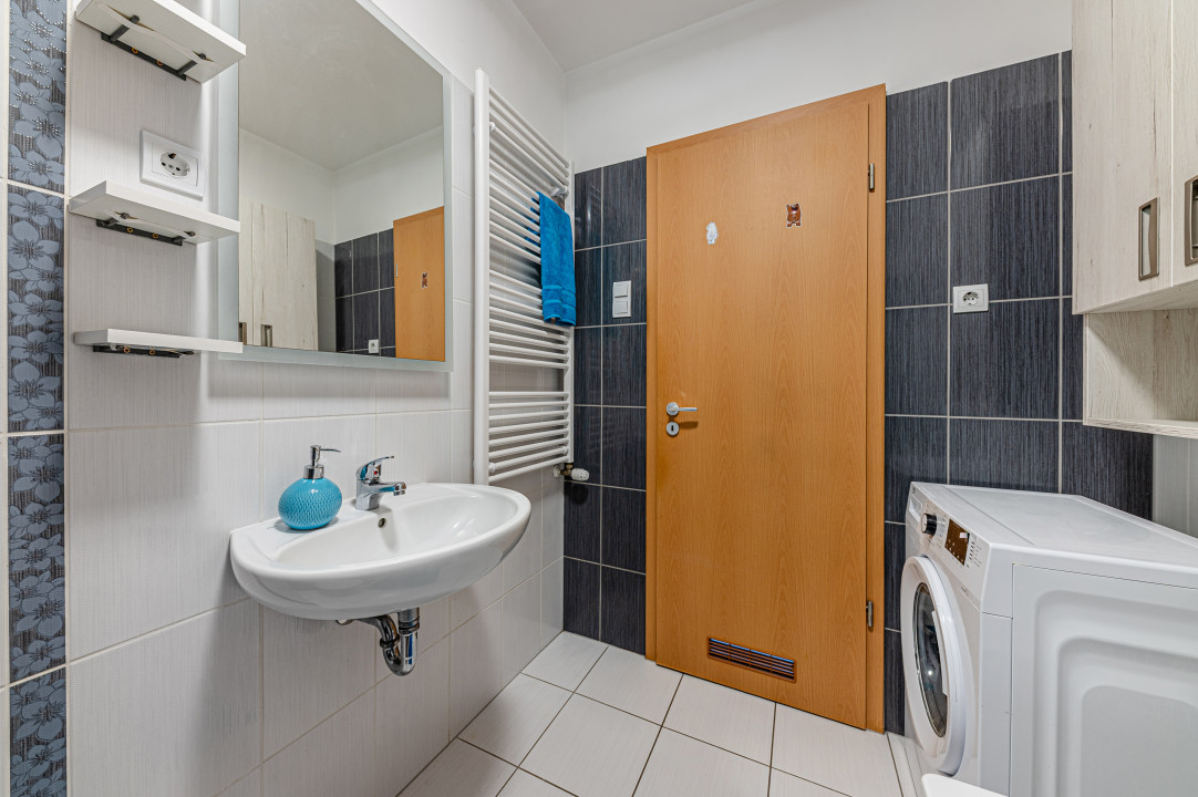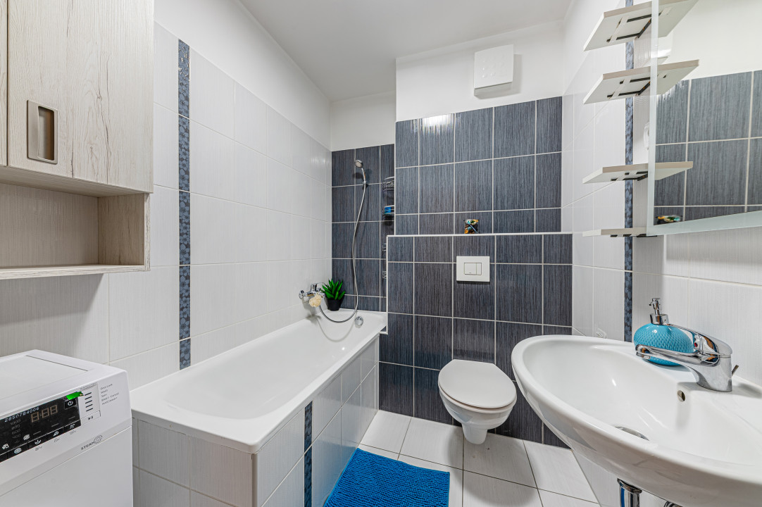 A fürdőszoba modern burkolatokkal, minőségi szaniterekkel és mosógép-előkészítéssel várja új tulajdonosát.