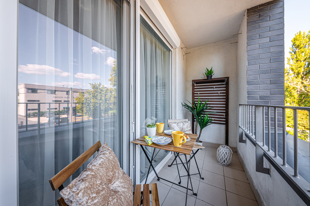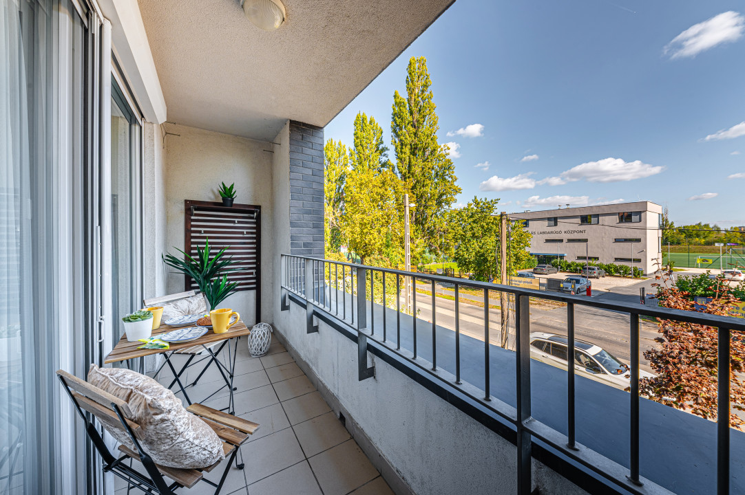 A 8 m²-es erkély kellemes szabadtéri pihenőhely, ideális reggeli kávézáshoz vagy esti borozáshoz.