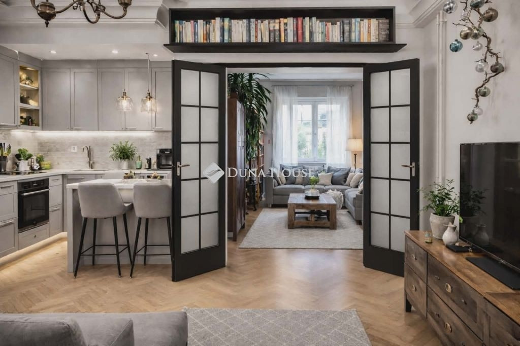 A jelenlegi 2 szoba + hall + félszoba elrendezés rendkívül rugalmasan alakítható: két külön ponton is megvalósítható amerikai konyhás tér. A konyha a mellette lévő félszobával összenyitható, így elegáns étkezős konyha és külön háló alakítható ki, vagy a jelenleg is nappali funkciót betöltő hall formálható modern, amerikai konyhás élettérré.