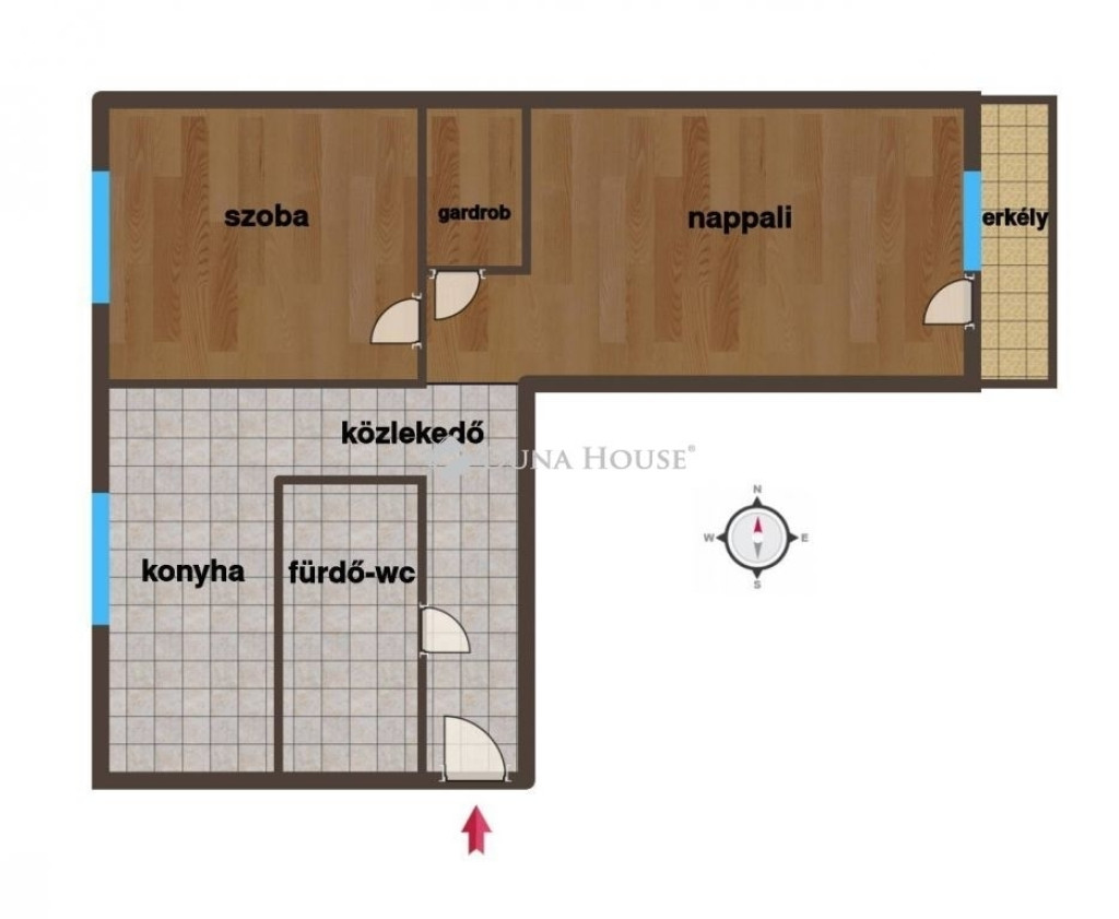 A nappali utcai nézetű és keleti fekvésű, a hálószoba és a konyha a házak közötti zárt udvarra néz, így ezek a helyiségek délután napfényesek és csendesek.