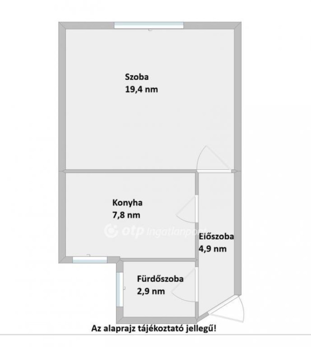 Az ingatlan kialakítása: szoba (19,4 nm), konyha (7,8 nm), fürdőszoba (2,9 nm), előszoba (4,9 nm). A szobában laminált padló, a többi helyiségben járólap van. A régi nyílászárókat kicserélték fehér, műanyag, thermo üveges nyílászárókra.