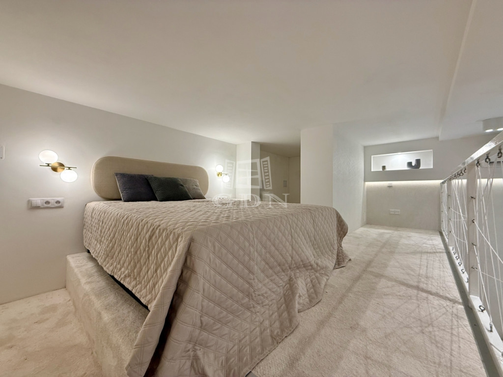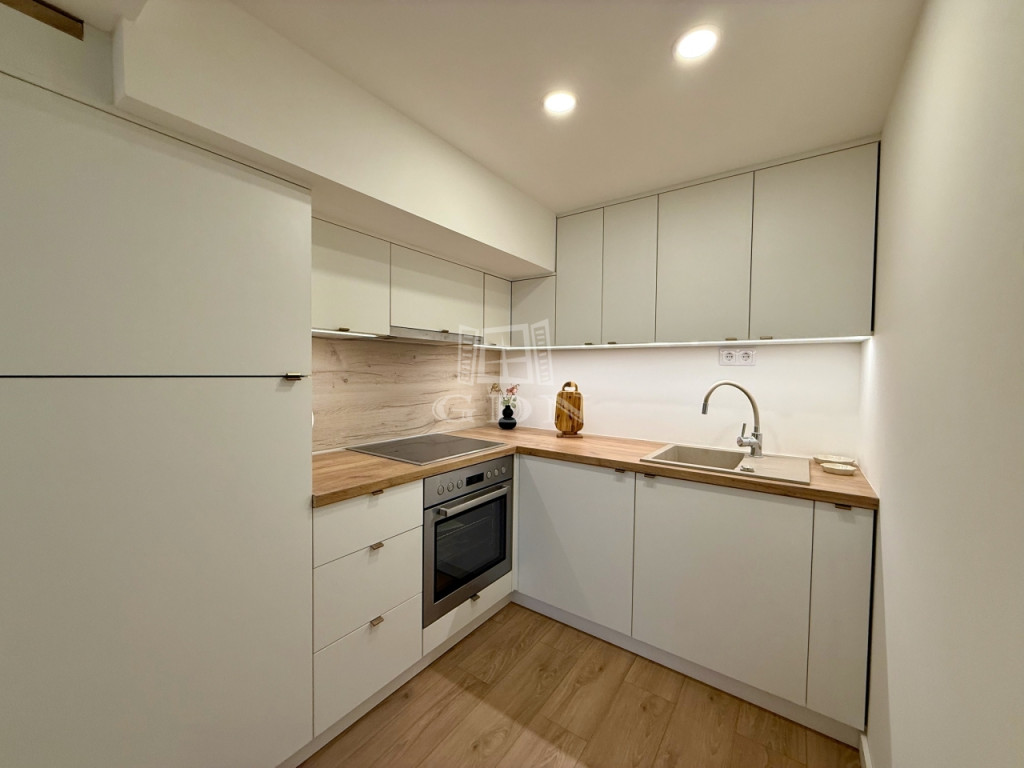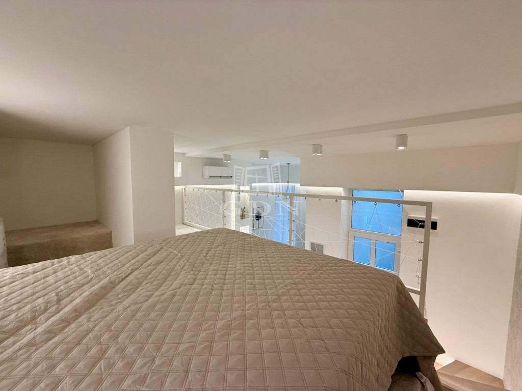 A koncepció lényege az élhető tér kis alapterületen. A megfelelő belmagasság lehetővé tette a galériás kialakítást, így a nappali és hálófunkció elkülönül, ami érezhetően javítja a használhatóságot és a kiadhatóságot. Az anyaghasználat, a burkolatok és a gépészet nem kompromisszumos megoldások: tartós, időtálló, karbantartható elemek kerültek beépítésre.