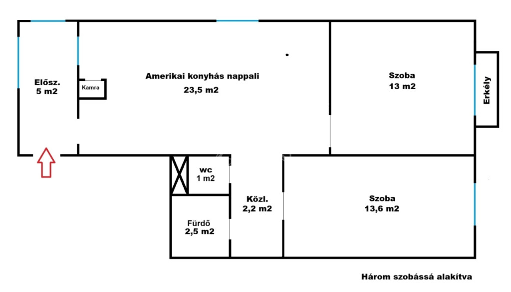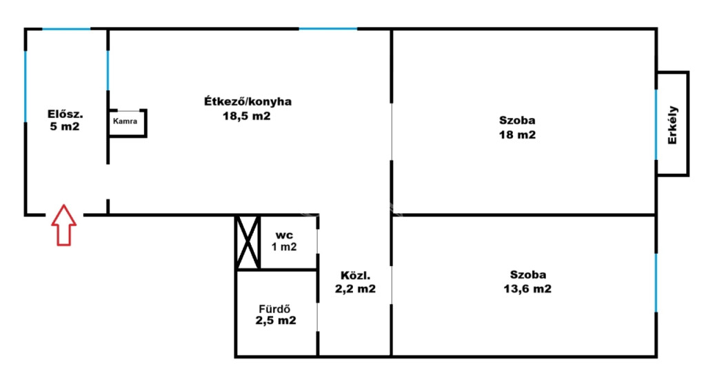 A lakás tulajdoni lap szerint 55 nm-es, 2 szobás. A tulajdonosok a társasháztól megvásároltak további 5 nm-t, mely előszobaként funkcionál.