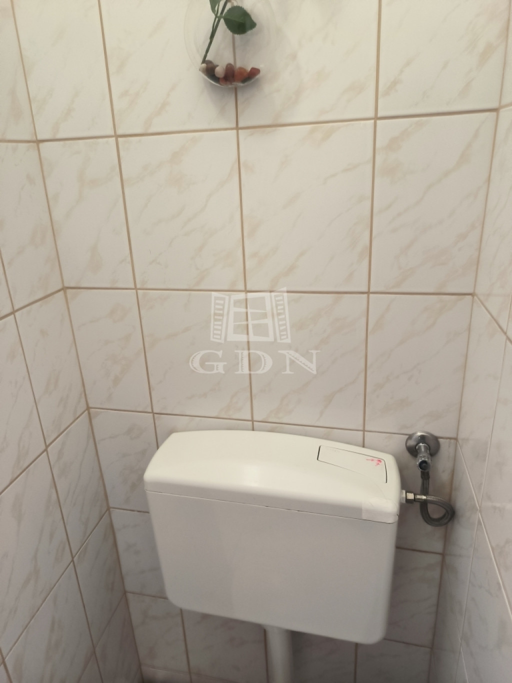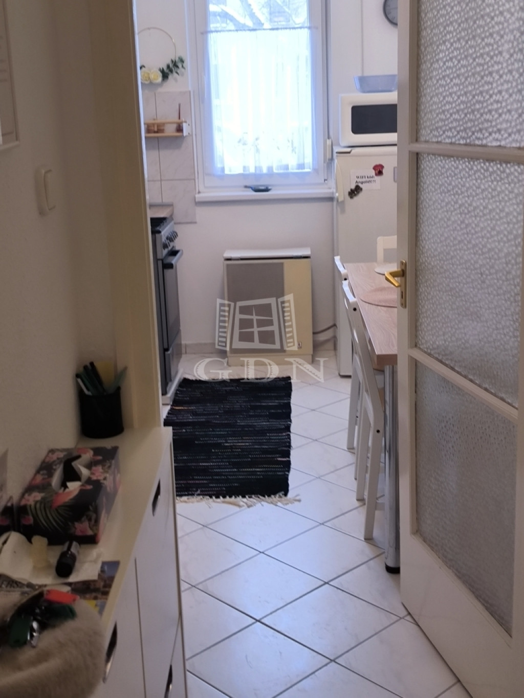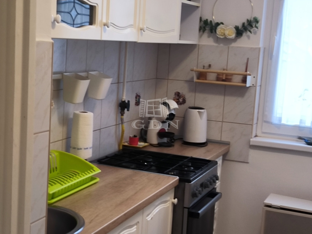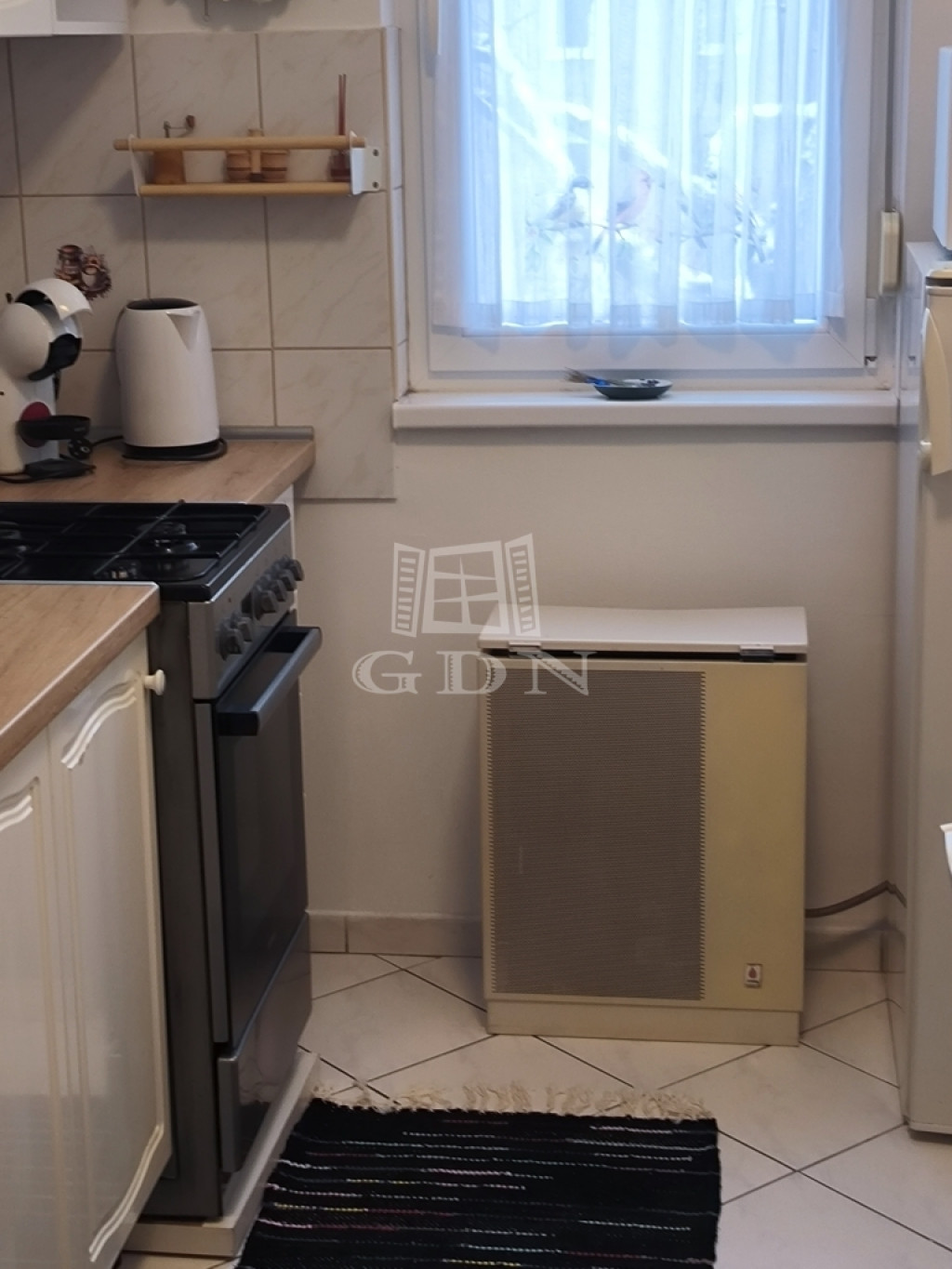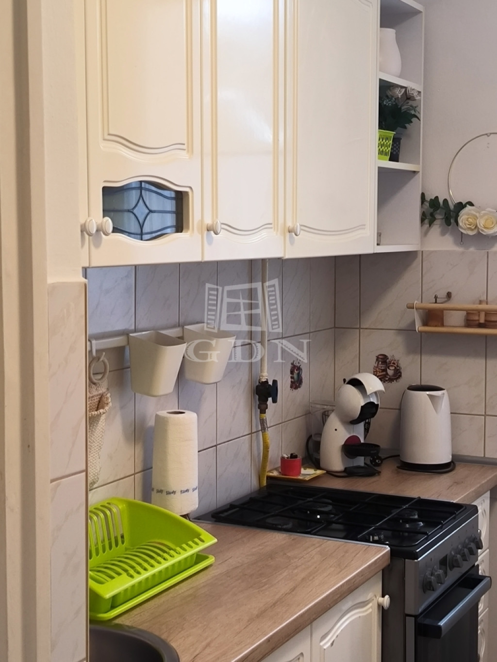 A konyha szintén beépített és étkezőasztal is van benne székekkel, mely a lakás részét képezi. Vízóra van a lakásban.