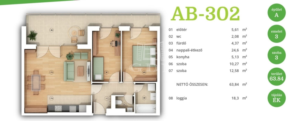 Ez a lakás nappali+2 hálós, 64nm alapterületű és tartozik hozzá egy 18nm-es terasz is.