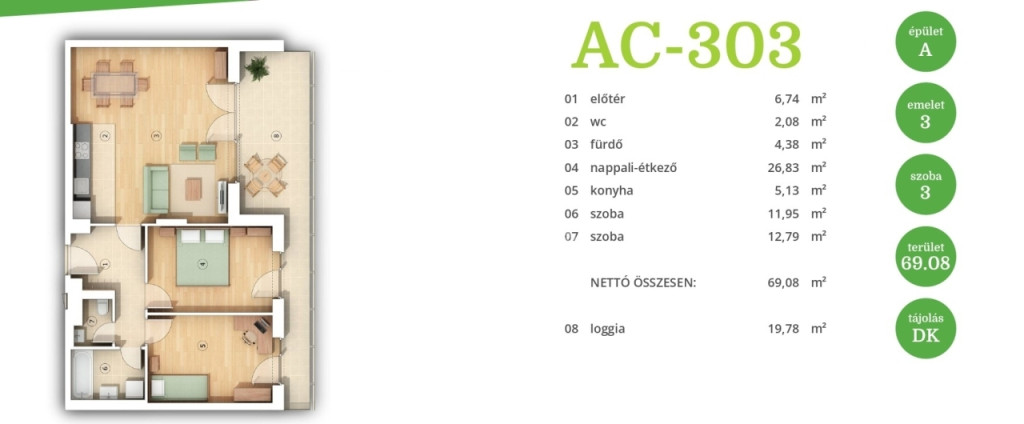 Ez a lakás nappali+2 hálós, 69nm alapterületű és tartozik hozzá egy 20nm-es terasz is.