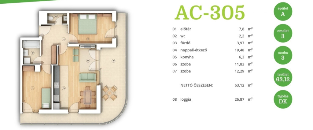 Ez a lakás nappali+2 hálós, 63nm alapterületű és tartozik hozzá egy 27nm-es terasz is.