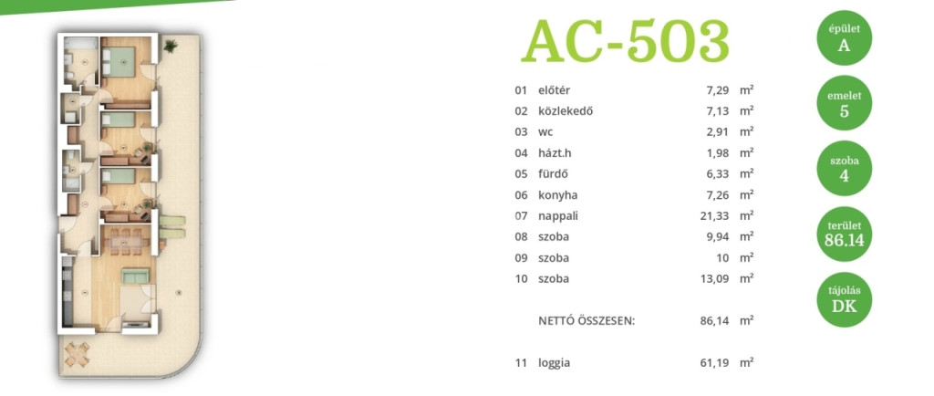 Ez a lakás nappali+3 hálós, 86nm alapterületű és tartozik hozzá egy 61nm-es terasz is.