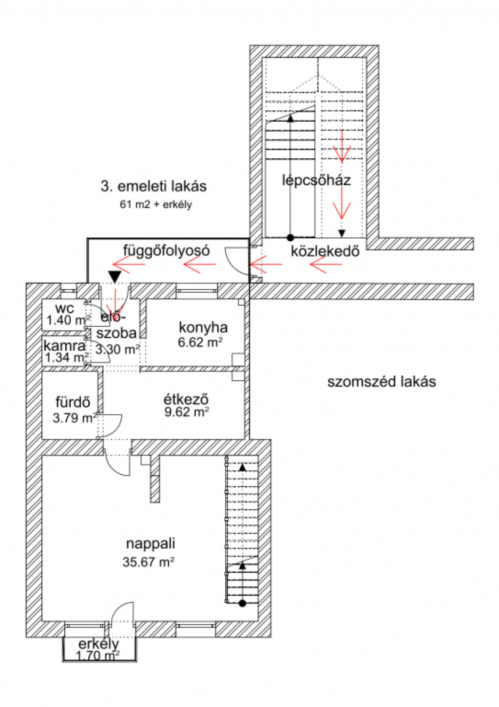 A függőfolyosókról megközelíthető, két egymás feletti lakásról van szó, amelyek egybe lettek nyitva egy belső lépcsővel. A 3. emeleti lakás 61 m2-es, a 4. emeleti 64 m2. A lakásba kívülről szintenként külön-külön is bejuthatunk. Így alkalmas lehet otthon + vállalkozás kialakítására is (pl ügyvédi iroda, társasházi képviselet, stb), vagy akár nagycsaládosoknak.