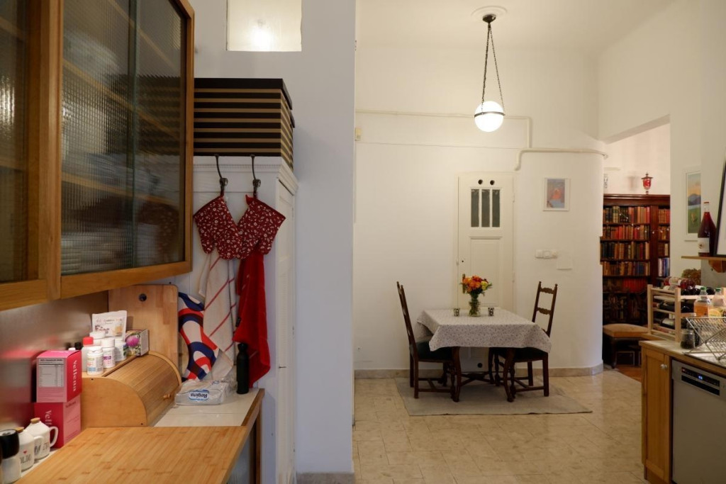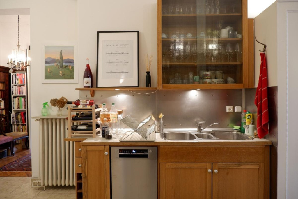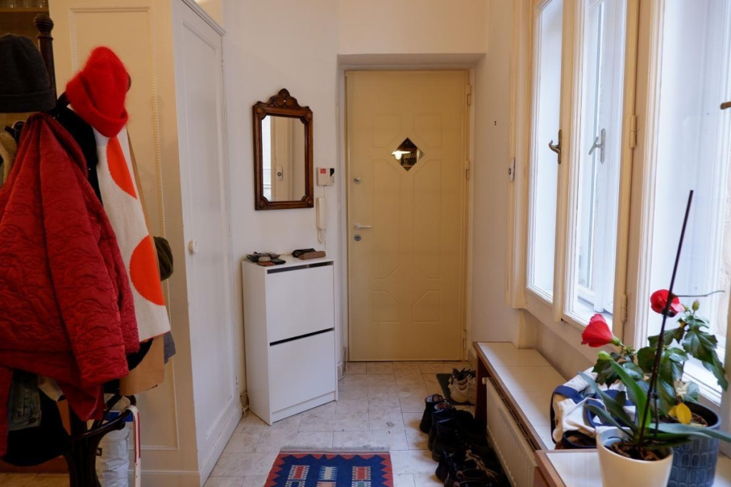 Előszobája - egy korábbi átalakítás után - az oldalkertre néző hatalmas ablakokkal épült tágas helyiségként fogadja a belépőt, a bútorozott konyha-étkezővel közös légtérben, innen nyíló háztartási helyiséggel, kis kamrával.