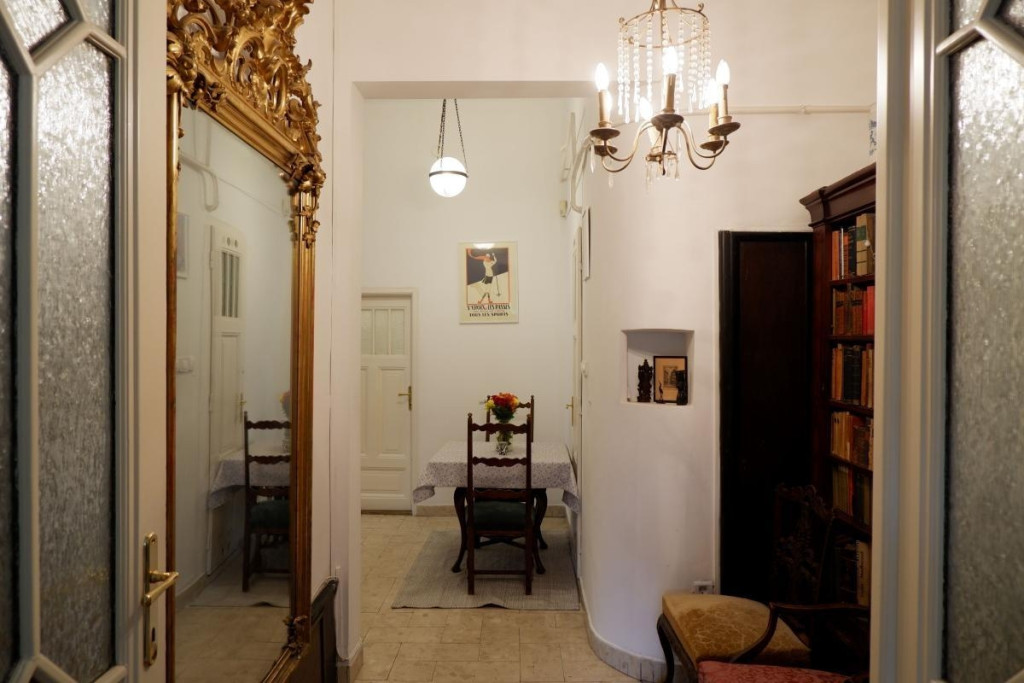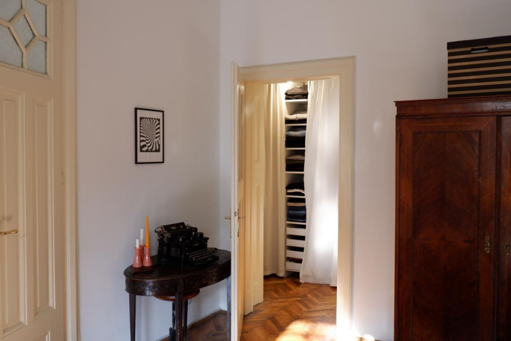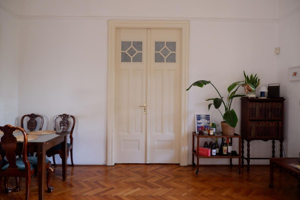 Mindkét szoba és a mindkettőből nyíló - a megőrzött, látványos ajtókon keresztül járható - íves boltozatú, 18m2-es terasz az utca csekély forgalma felől hatalmas fákkal és az ikonikus Oroszlánnal védett, akár nagyobb társaság számára is kellemes, hangulatos, zavartalan pihenőhely lehet.