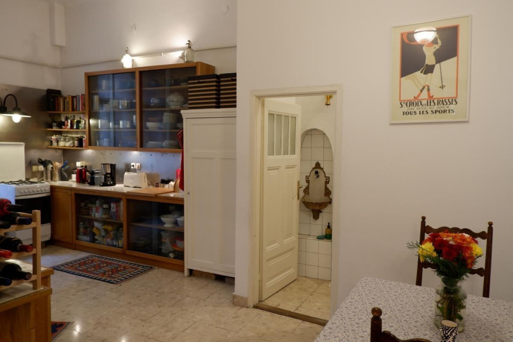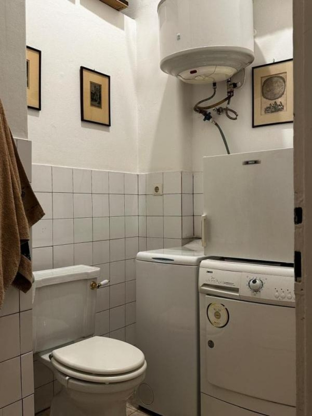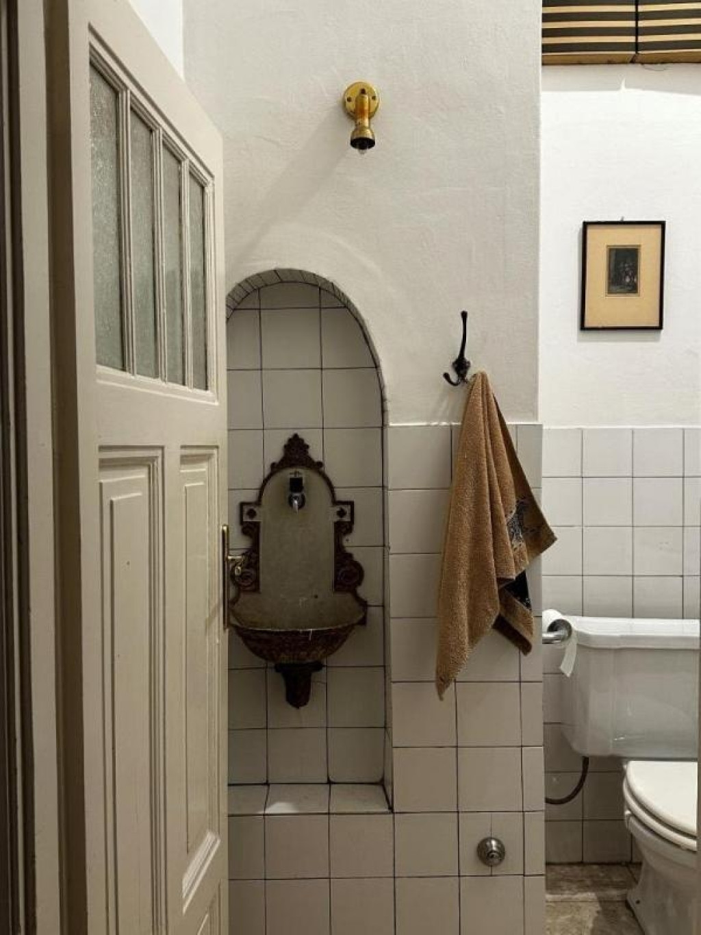 A külön nyíló háztartási helyiségben helyezték el a használati melegvizet adó bojlert, itt a WC mellett egy eredeti falikút működik.
