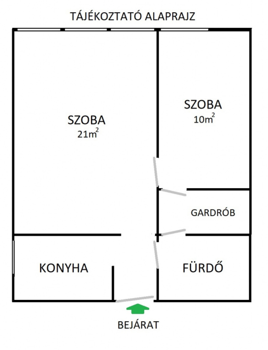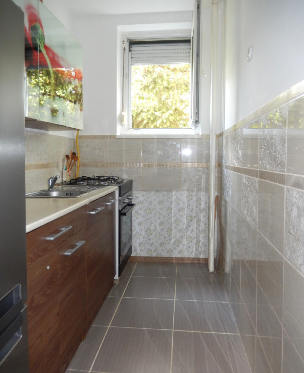 Szobái külön és egymásból is nyílnak. Az ablakos konyhában különleges beépített szekrény van. A kisebb szoba mellett jól kihasználható gardrób található.