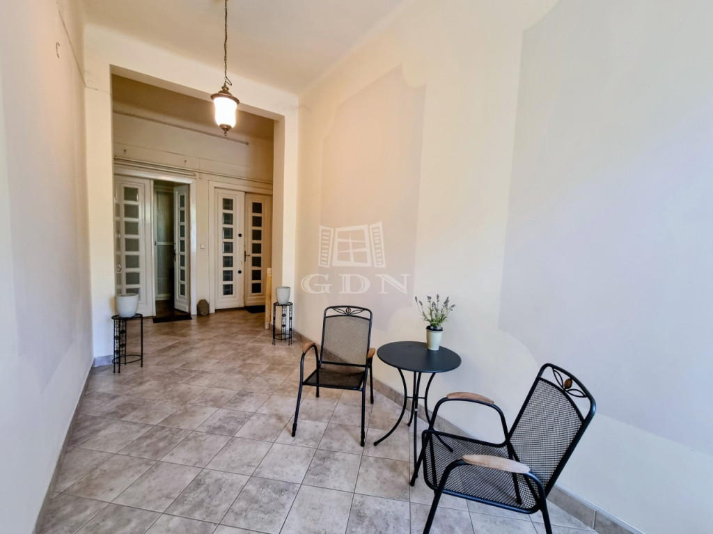 Térkiosztása: bejáratnál klasszikus előszoba/közlekedő fogad minket, ahonnan megközelíthető a káddal és mellékhelyiséggel felszerelt fürdőszoba, továbbá egy vendég mellékhelyiség és az amerikai konyhás nappali ahol a konyha résznél egy kamra is helyet kapott. A nappaliból egy négyszárnyas ajtón bejutva közelíthetjük meg a hálószobát, ahol praktikusan - a tárolást segítő - átjárható gardrób lett kialakítva. A társasház külső építészeti stílusjegyei szépen harmonizálnak a lakás belső kialakításával, a felújítások során megőrizték a belső ajtókat, a fotókon látható bútorok megállapodás alapján megvásárolhatóak. A kertben egy gépjárműnek felszíni bálló lehetősége állhat rendelkezésre, picében további tárolási lehetőség is megoldott. Mindazoknak ajánlom akik Zugló kiemelt negyedében, kiváló lokációnál keresnek egy stílusos, igényes, kényelmes otthont, valamint azoknal is akik több generációval költöznének, hiszen a szomszéd 86 nm-es ingatlan is eladó, amely szintén megtalálható kínálatunkban.