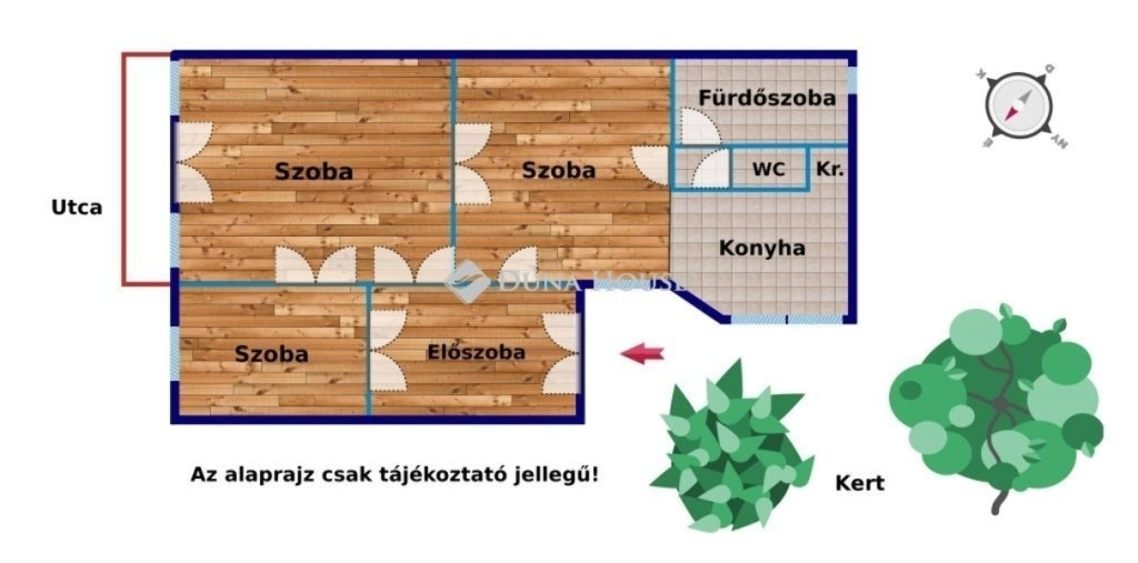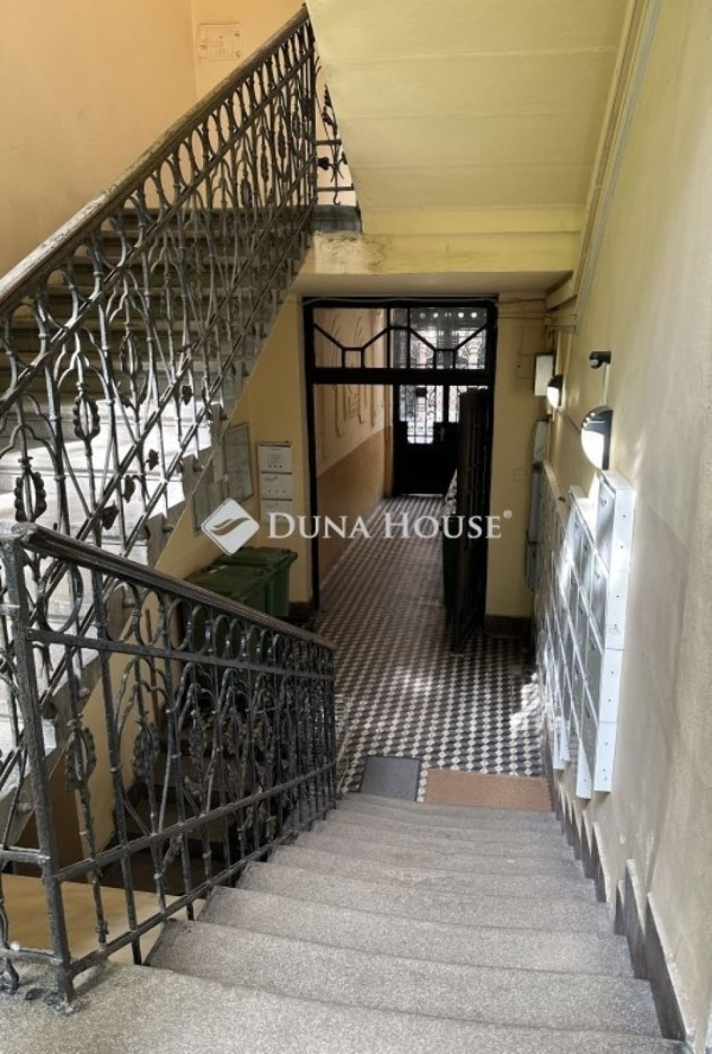 Az utca felől megközelítve az ingatlan magasföldszinti az elhelyezkedése, de a bejárati ajtó egy csendes belső kertből nyílik.