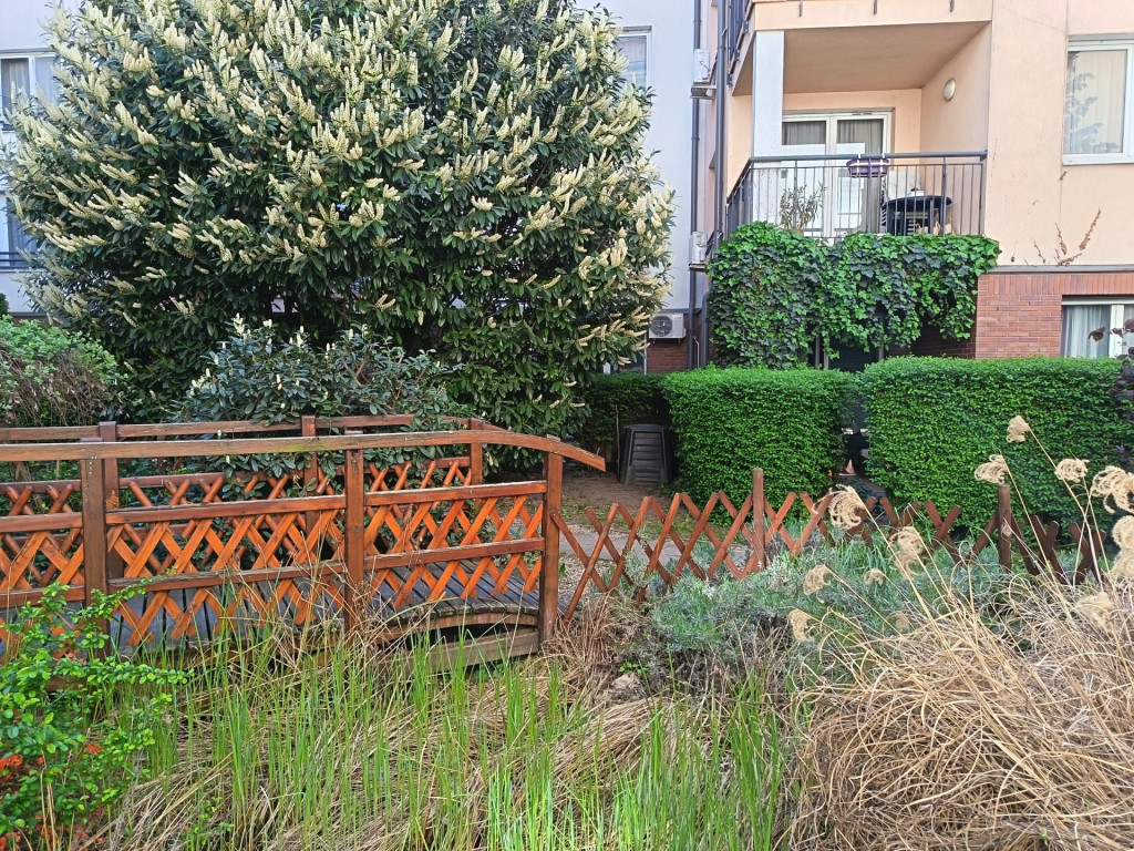 kert, a játszótér, a padok és virágok kellemes környezetet nyújtanak a lakók számára.