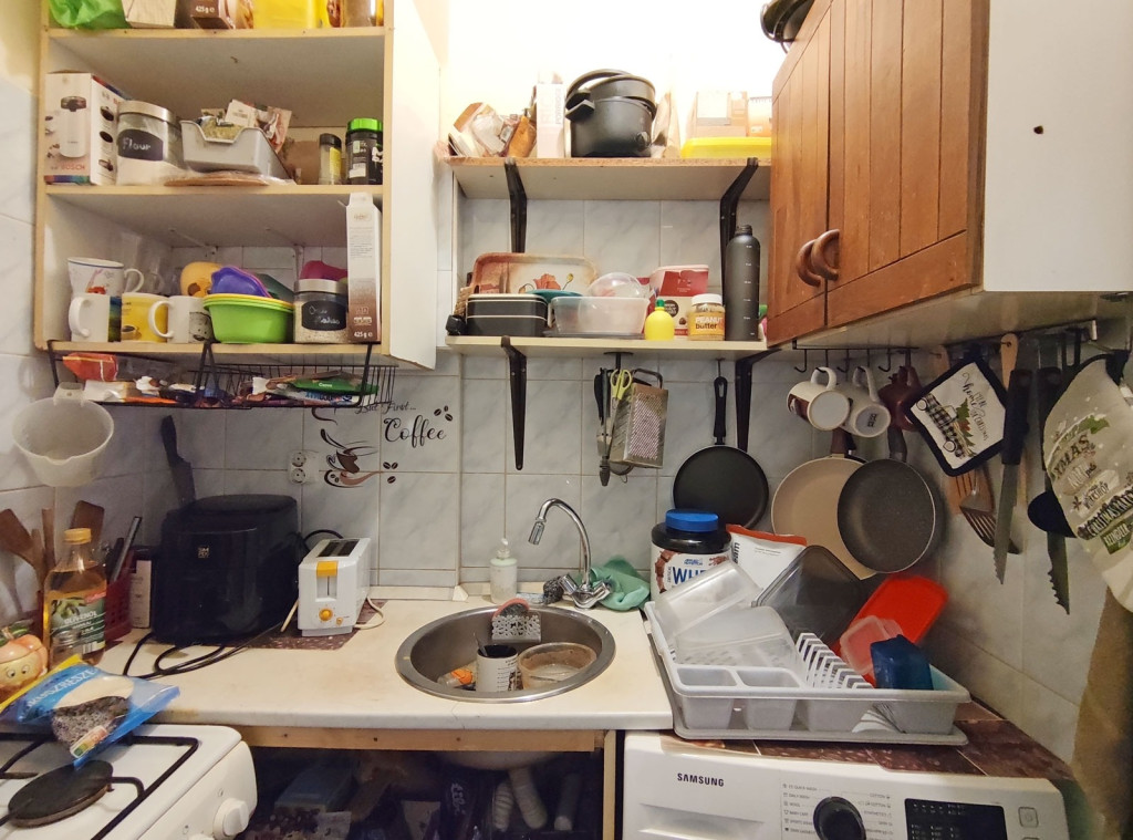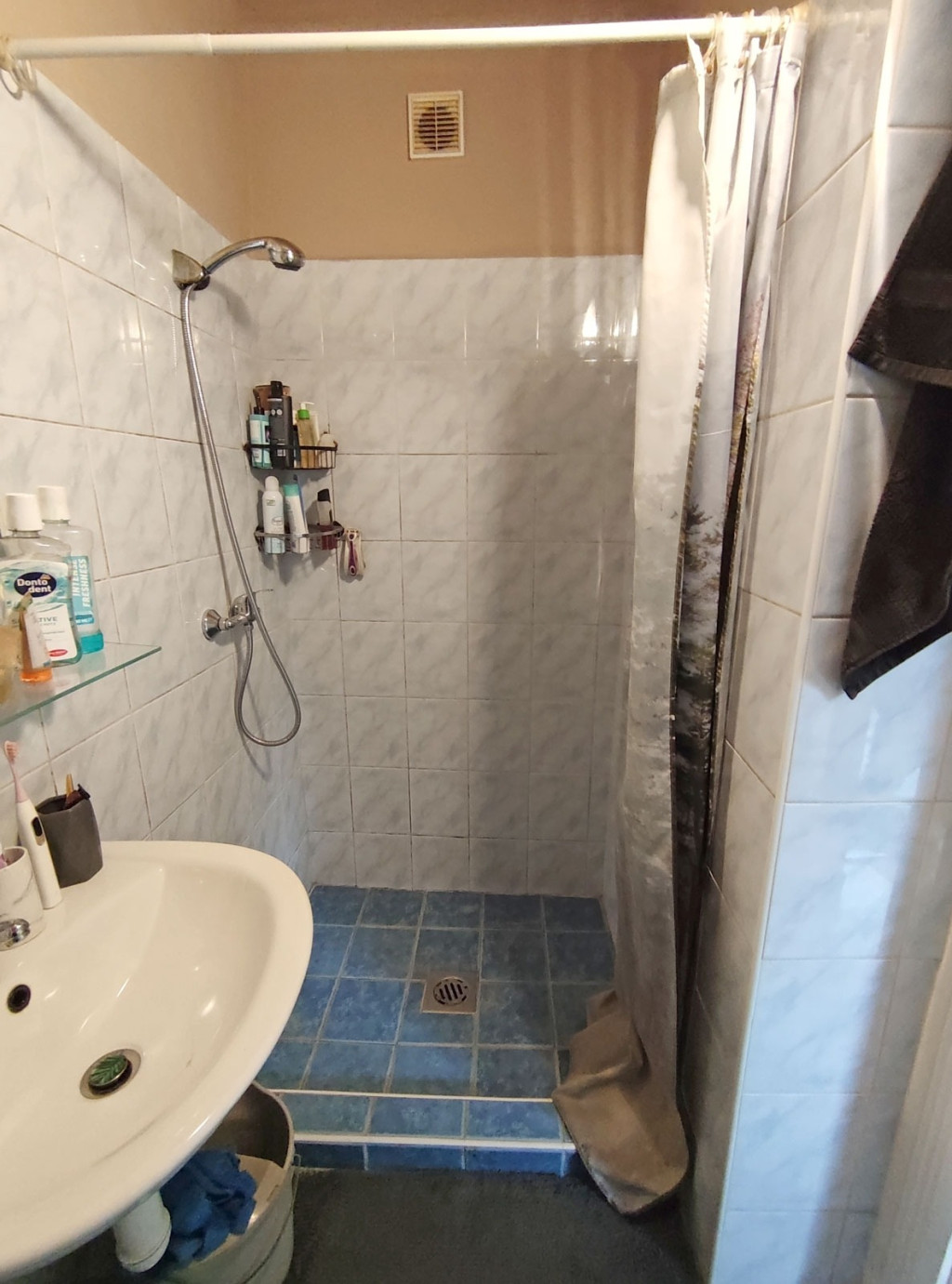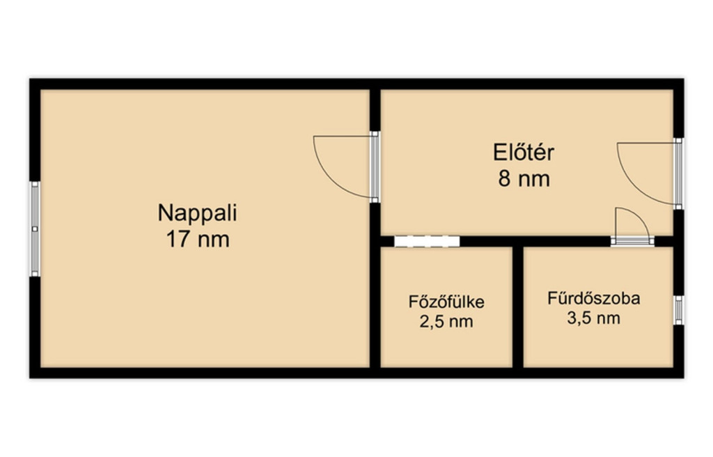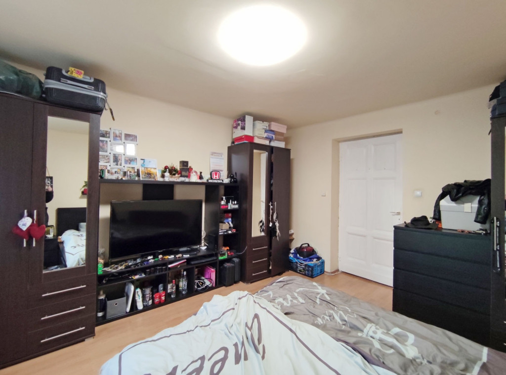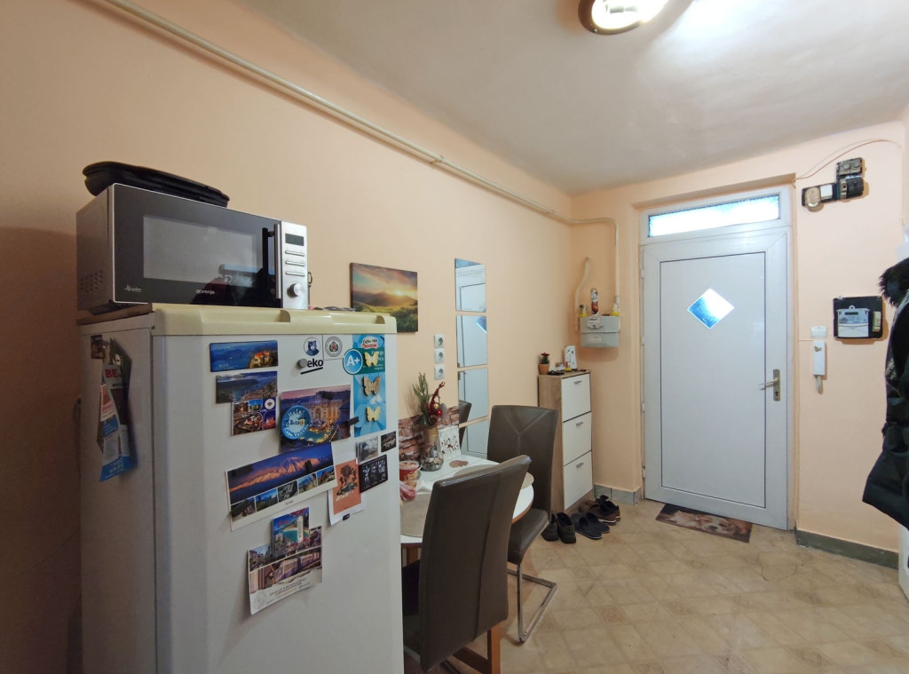 Belépve a lakásba a bejárattal szemben a 17 nm-es keleti fekvésű világos szobába juthatunk, ami reggelente fényárban úszik. A 8 nm-es járólapos előtérben balra nyílik a világos, kis ablakos 3,5 nm-es, csempézett épített zuhanyzós fürdőszoba, amely magában foglalja a WC-t is. Az előtérből tovább haladva szintén balra találjuk a 2,5 nm-es, gáztűzhellyel felszerelt, bútorozott főzőfülkét, amiben a mosógép is helyet kapott.