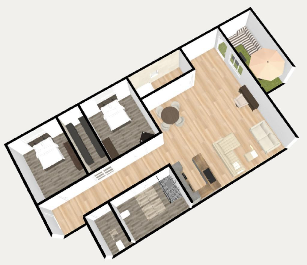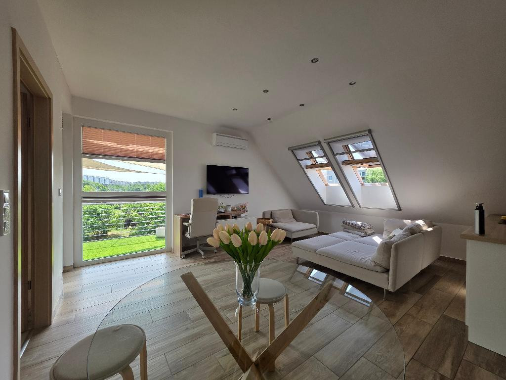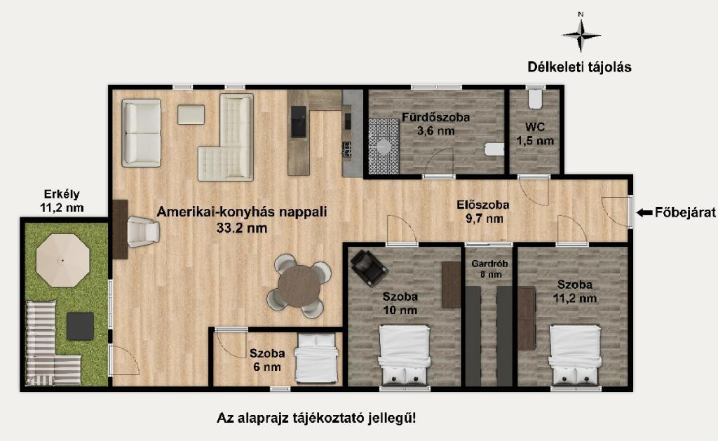 Jelenlegi elrendezése praktikus, hiszen a 2,7 méteres belmagasságának, tágas amerikai-konyhás nappalijának, valamint a 3 szobájának köszönhetően plusz teret és kényelmet nyújt. Továbbá világos és fényes atmoszférát biztosít az ingatlan délkeleti fekvése. A lakásba belépve egy tágas előtér fogad, ahonnan könnyen elérhetőek a külön nyíló helyiségek, mint például két szoba, fürdőszoba, illemhelyiség, valamint a gardróbszoba. Tovább haladva elérkezünk az amerikai-konyhás nappaliba, ahonnan elérhető az étkező, a hálószoba, illetve a 11 négyzetméteres, berendezett, műfüves erkély.