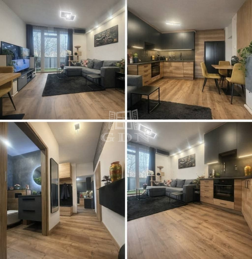 A modern, igényes kialakítás minden helyiségben visszaköszön: egyedi hangulatvilágítás, minőségi burkolatok, letisztult design. A fürdőszoba épített zuhanyzós, külön háztartási helyiség is kialakításra került.