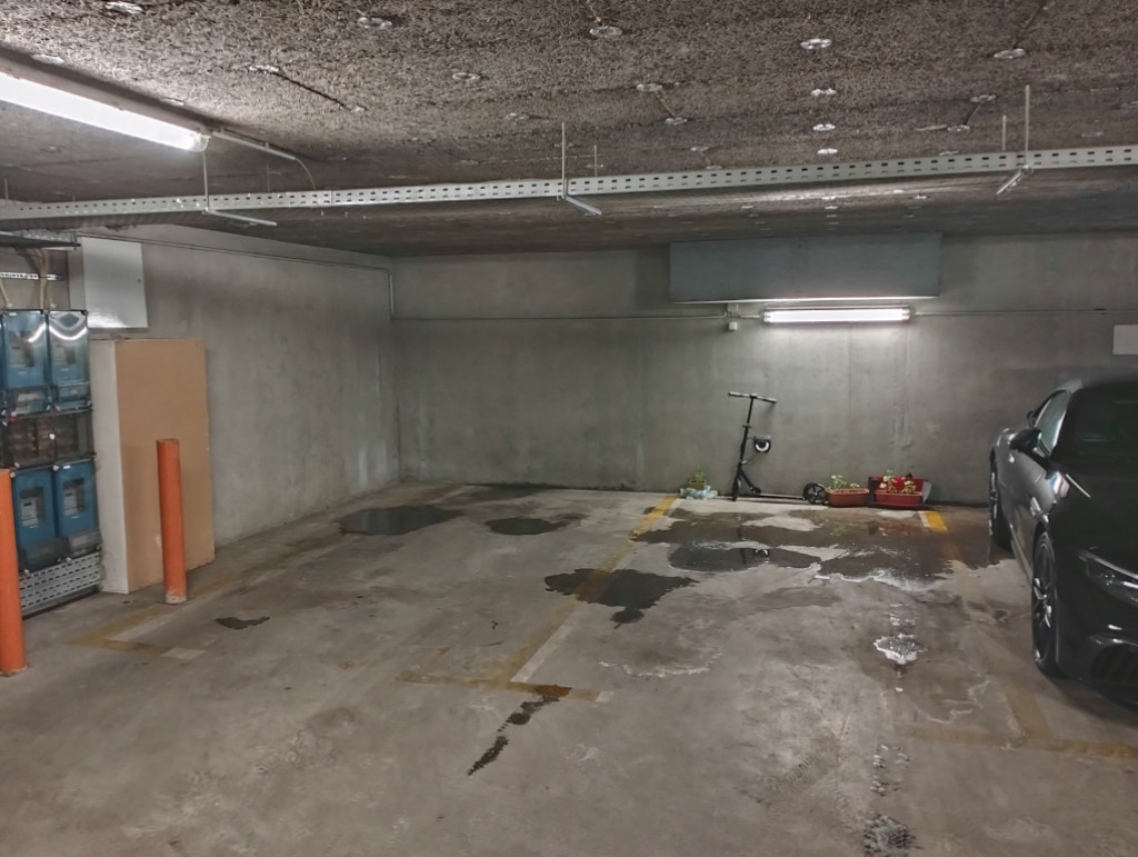 Egy önálló helyrajzi számmal rendelkező teremgarázs-beálló is eladó a társasház mélygarázsában 8 millió forintért.