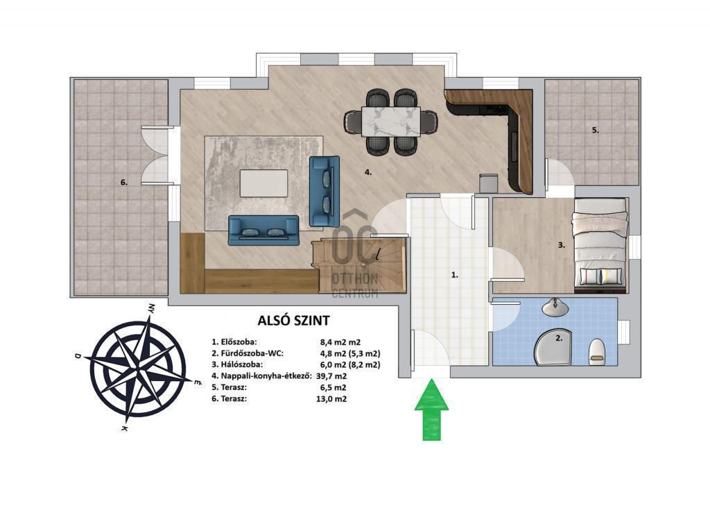 - A nappaliból nyíló nagyobb terasz a déli, napos oldalon található.