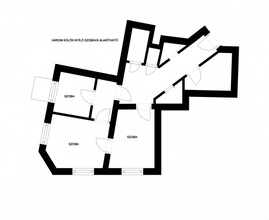 Minimális átalakítással 3 önálló bejáratú szoba is kialakítható.