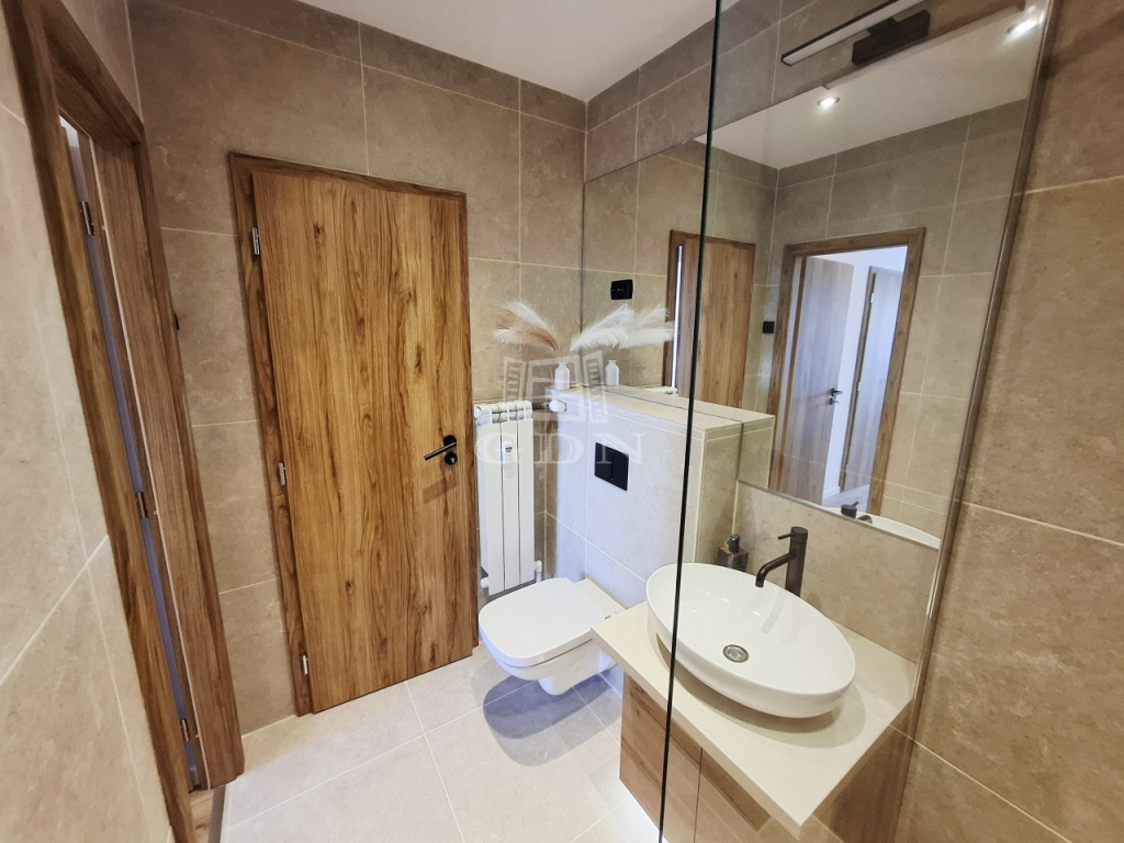 új, letisztult stílusú konyha és fürdőszoba.
