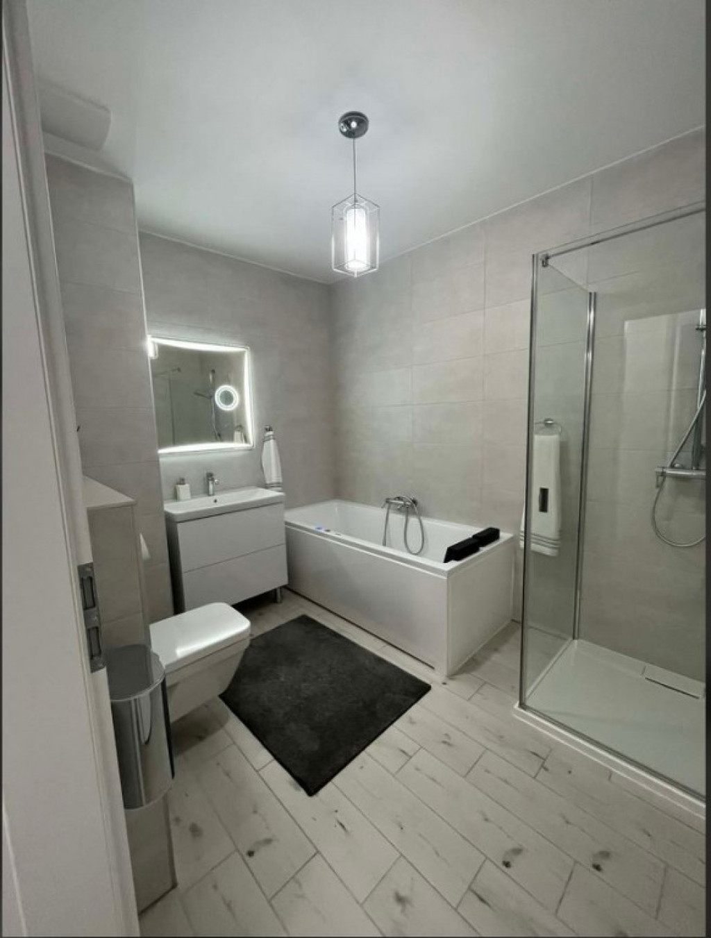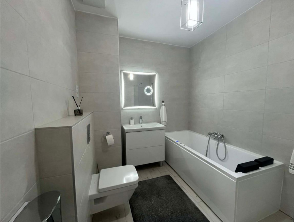 A fürdőszobába pezsgőfürdős fényterápiás kád lett beépítve.