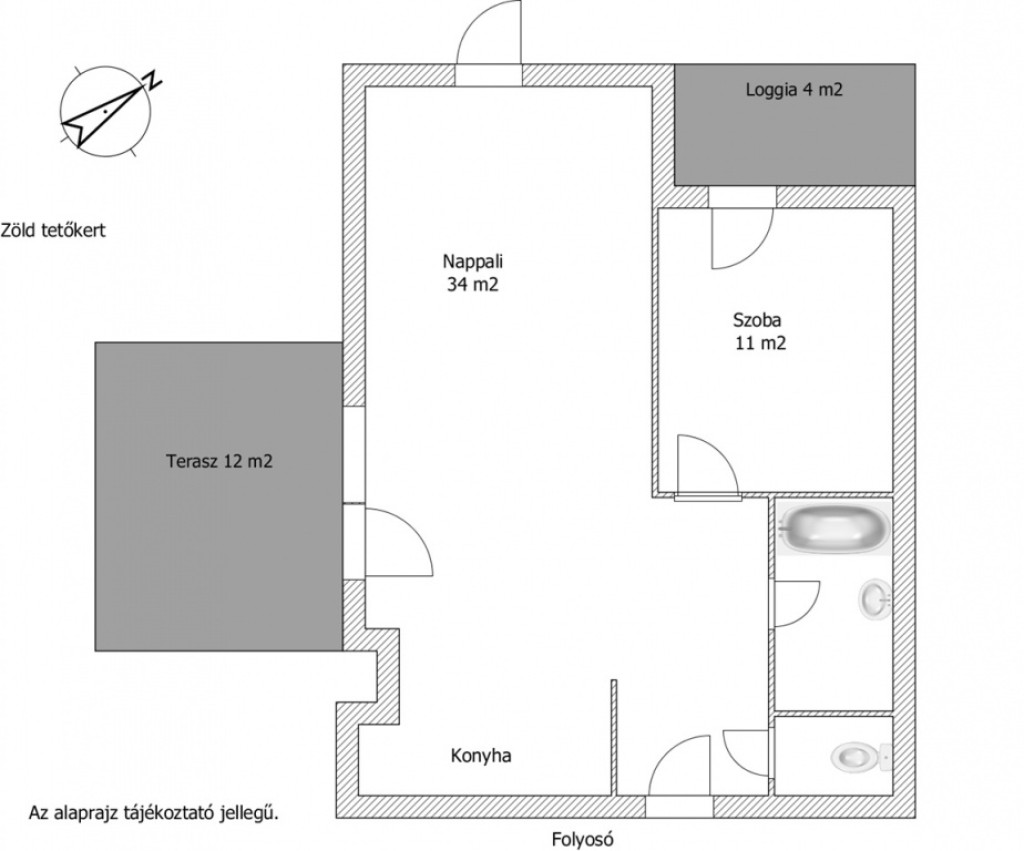 Konyhabútor nincs az árban. A fürdőszoba mellett külön helyiségben található a WC.