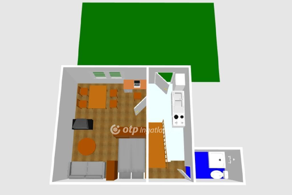 A belső kétszintes elrendezés jól elkülöníthető élettereket kínál: az alsó szinten konyha, fürdő és egy közel 20 m²-es, sokoldalúan használható szoba található, míg a felső szinten egy tetőtéri szoba és gardróbnak alkalmas közlekedő kapott helyet. Az épület bővíthető, akár további helyiség vagy emeleti fürdőszoba kialakításával.