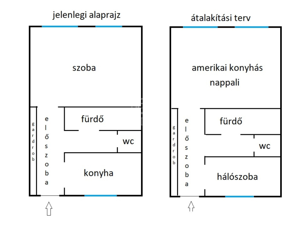 A konyha áthelyezésével egy amerikai konyhás nappali és egy hálószoba könnyedén kialakítható!