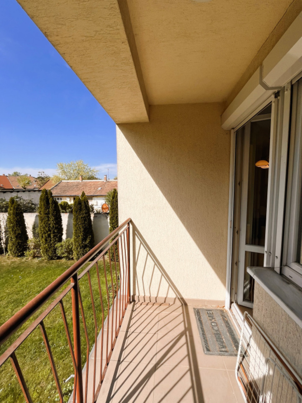 A lakás nyugati fekvésének köszönhetően nagyon világos, és az erkélyről zöldre nyíló, intim kertre néző kilátás fogad.
