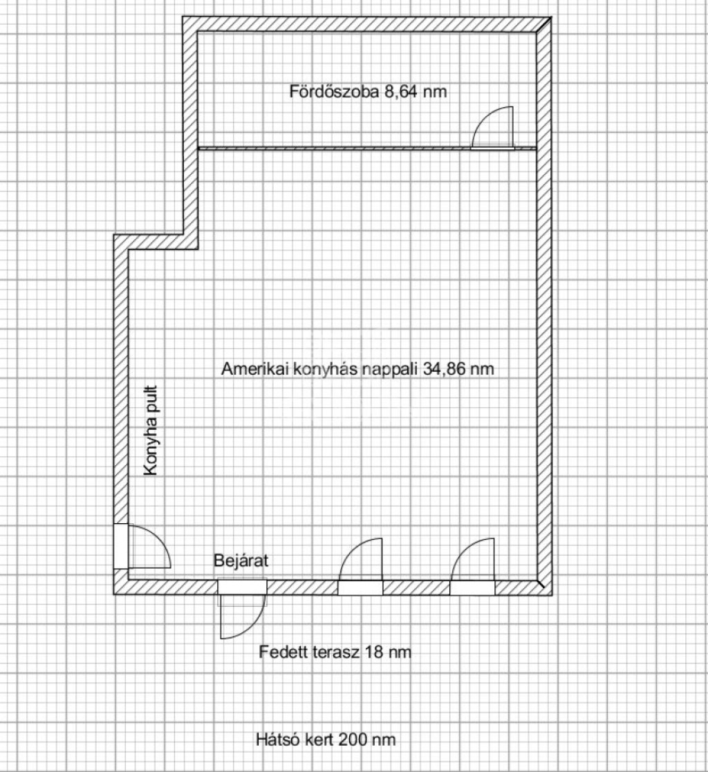 Alapterülete 44 nm, jelenleg 1 nagy szobás, amerikai konyhás elosztású, de könnyedén 1,5-2 szobássá alakítható több féle alaprajzi lehetőséggel.