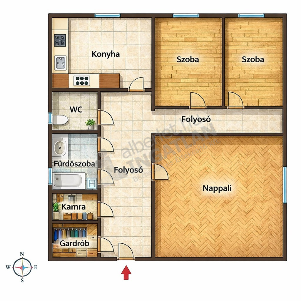 Elrendezése kiváló: 2 hálószoba + nappali, külön konyha, külön WC és fürdő, valamint 2 db tárolóhelyiség biztosítja a kényelmes mindennapokat.