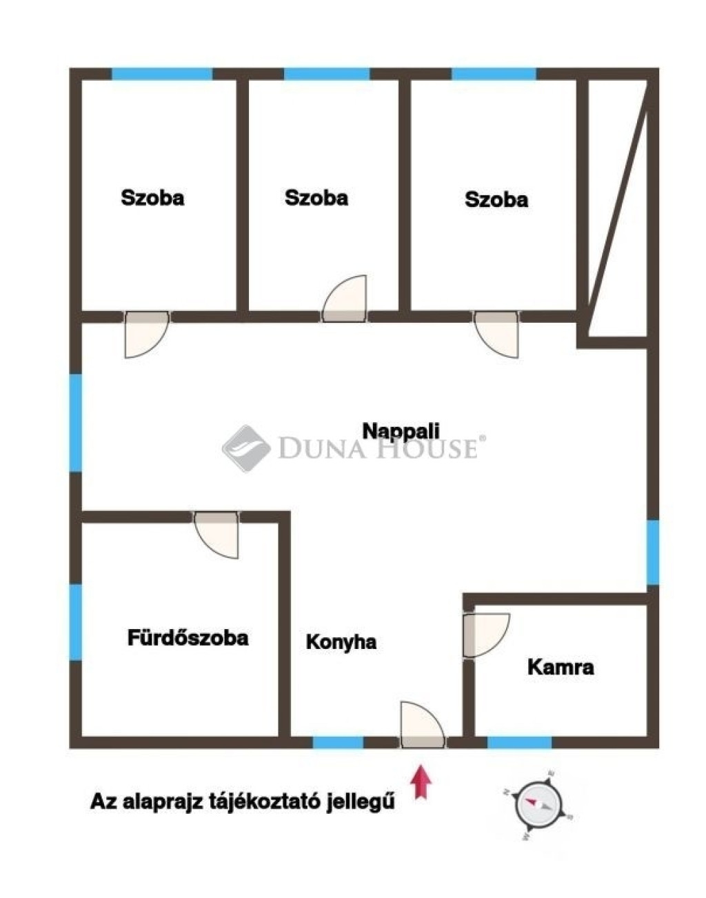 Elosztása:Nappali-étkezőkonyha egy légtérben, 3 külön nyíló szoba, Fürdőszoba, Kamra