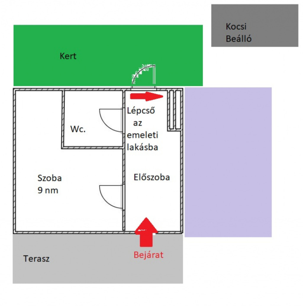 A lakás elosztása praktikus: a földszinten egy különálló szoba és WC található, mely egy tágas teraszról közelíthető meg, közvetlen kertkapcsolattal.