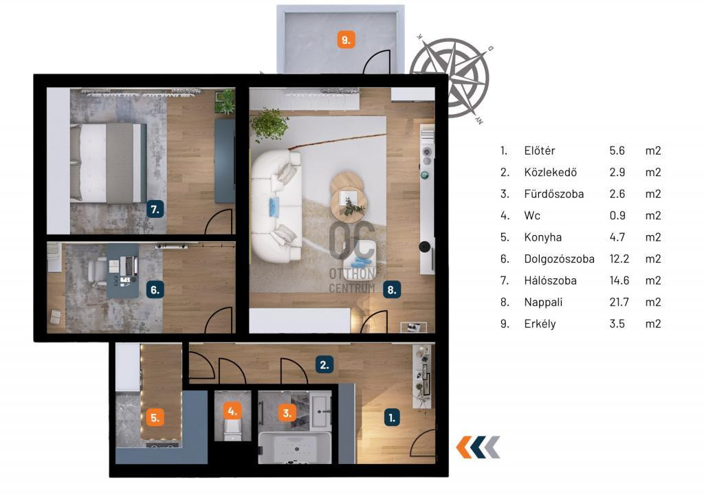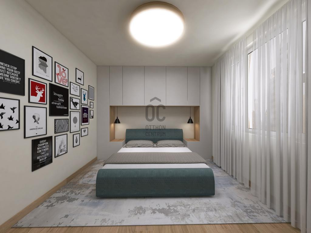 Külön konyhás elrendezés, jól szeparálható háló- és dolgozórész, ideális családoknak, otthonról dolgozóknak is.