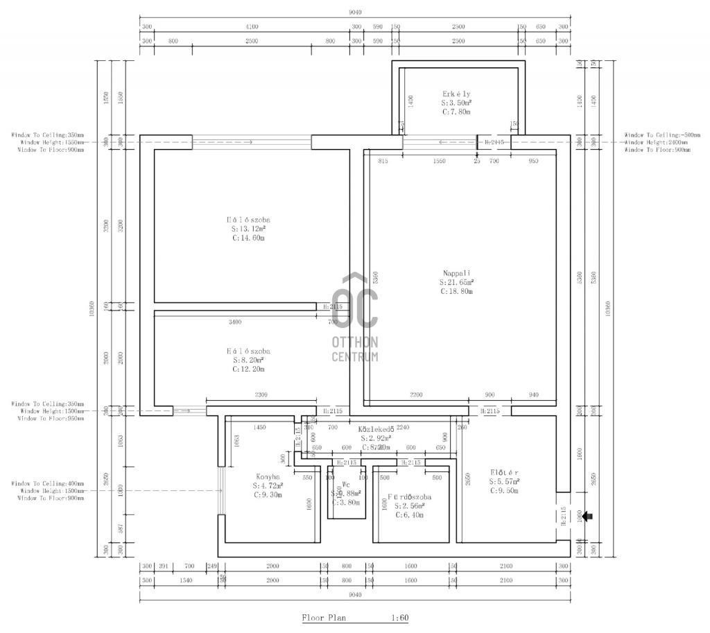Lakás elosztása: előtér, közlekedő, erkélyes nappali, hálószoba, dolgozószoba, ablakos konyha, kádas fürdőszoba, külön WC.