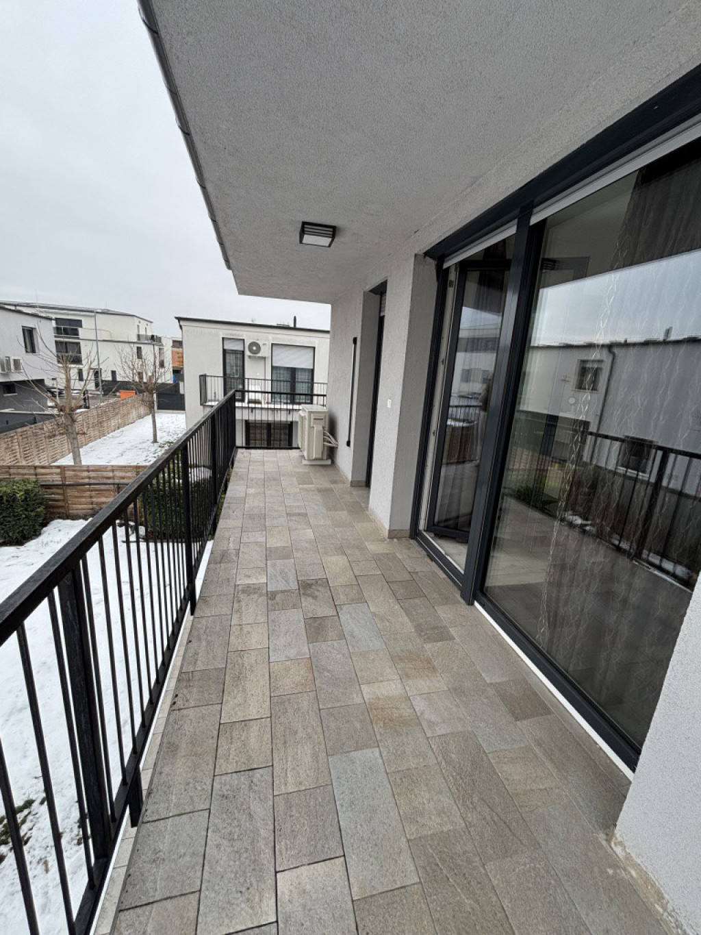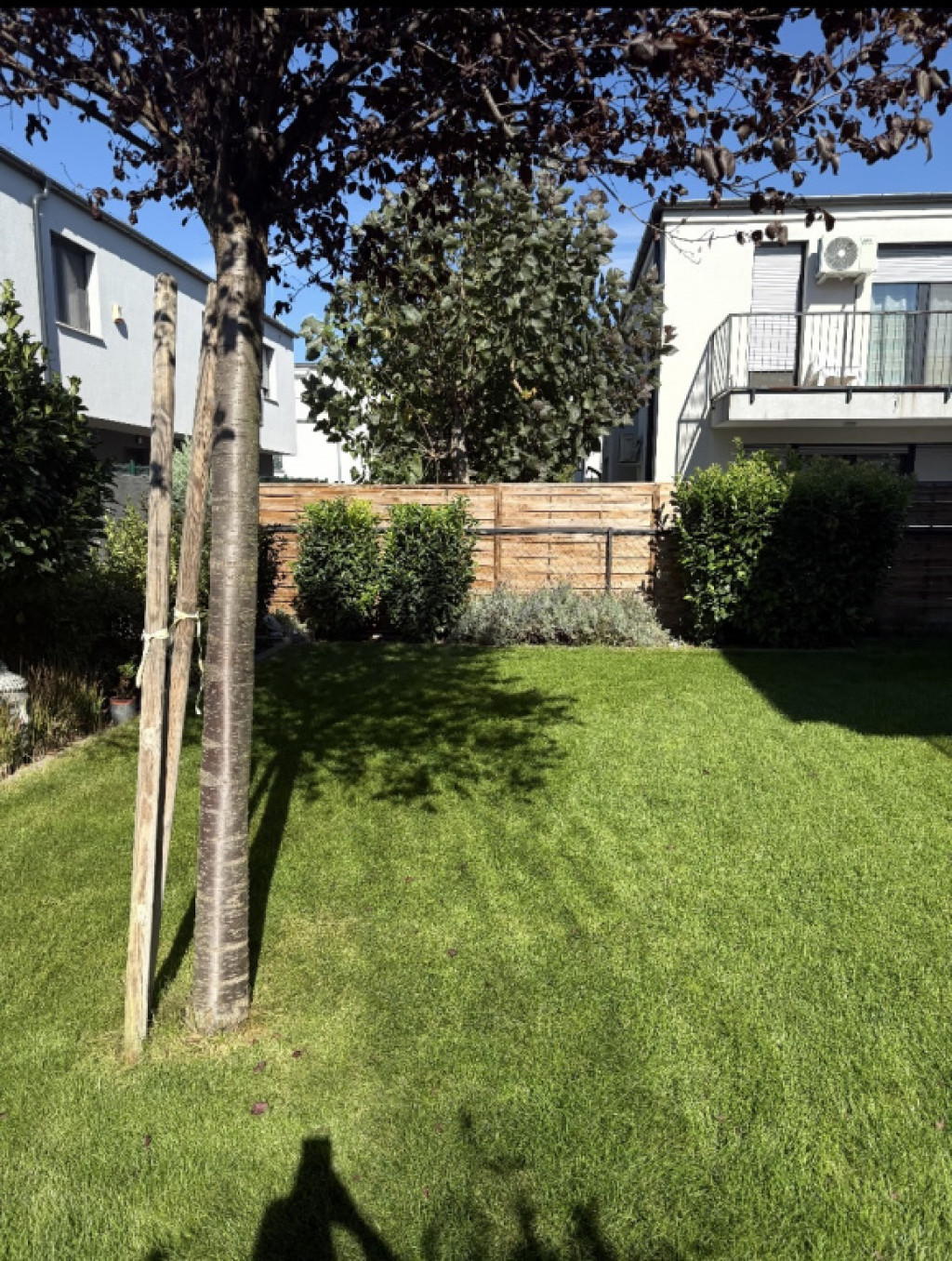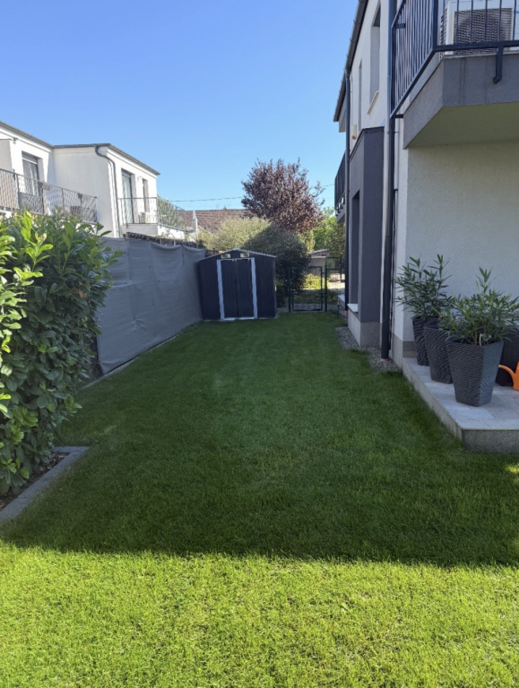Az emeleti hálószobákhoz tágas, kertre néző terasz csatlakozik, a nappali terasz és kertkapcsolatos. A 120 nm-es kert gyepszőnyeggel, dísznövényekkel, öntözőrendszerrel lett telepítve és egy tárolót is elhelyeztek rajta.