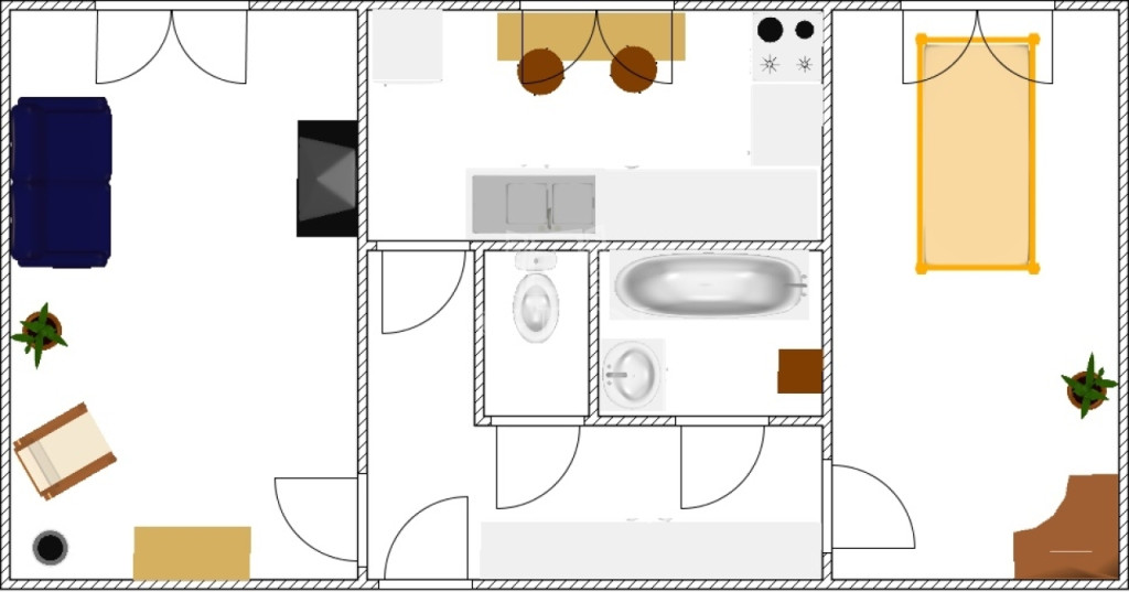 A lakás praktikus elrendezésű: minden helyiség külön nyílik az előszobából – nappali, hálószoba, konyha, fürdőszoba és külön WC.