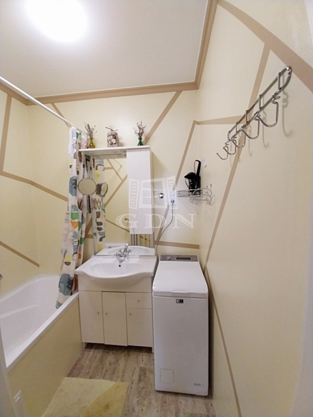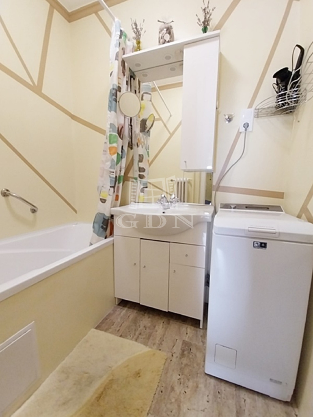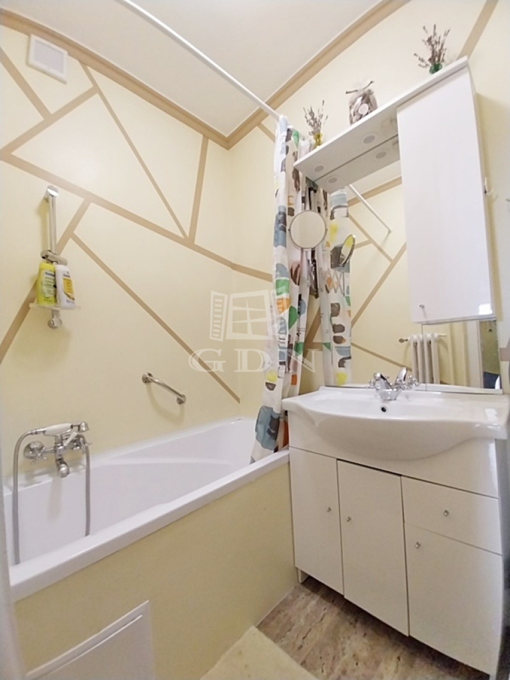 Bal oldalon kapott helyet a külön nyíló tartó szekrénnyel felszerelt 1 nm-es WC, mellette a 3 nm-es kádas újonnan kialakított fürdőszoba.