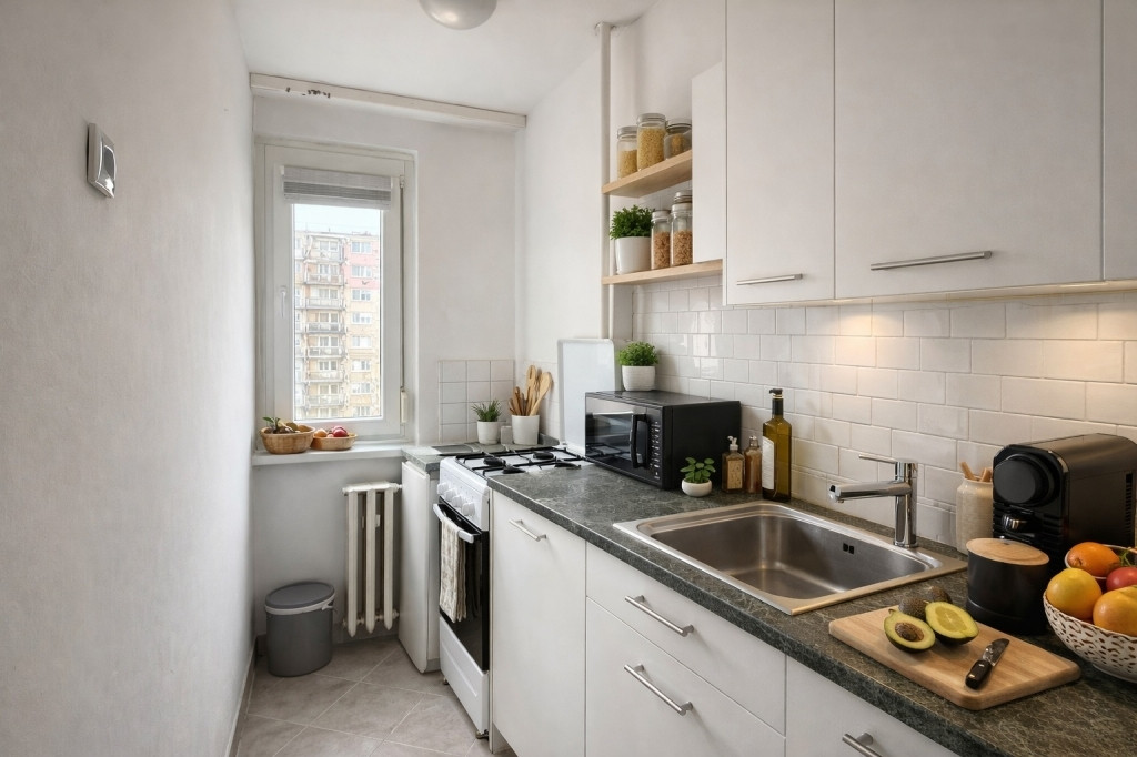 Nagy ablakos, jól szellőző konyha (amerikai konyhává alakítható)