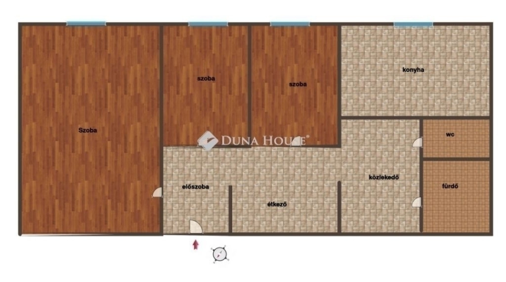 A szobák laminált parkettával, míg a többi helyiség igényes kőburkolattal lett ellátva.