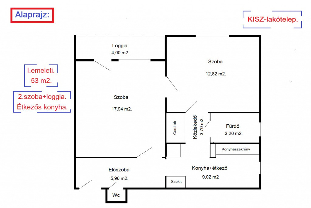 - 2 szoba, előszoba, ablakos konyha étkezővel, fürdő, külön WC, loggia.
